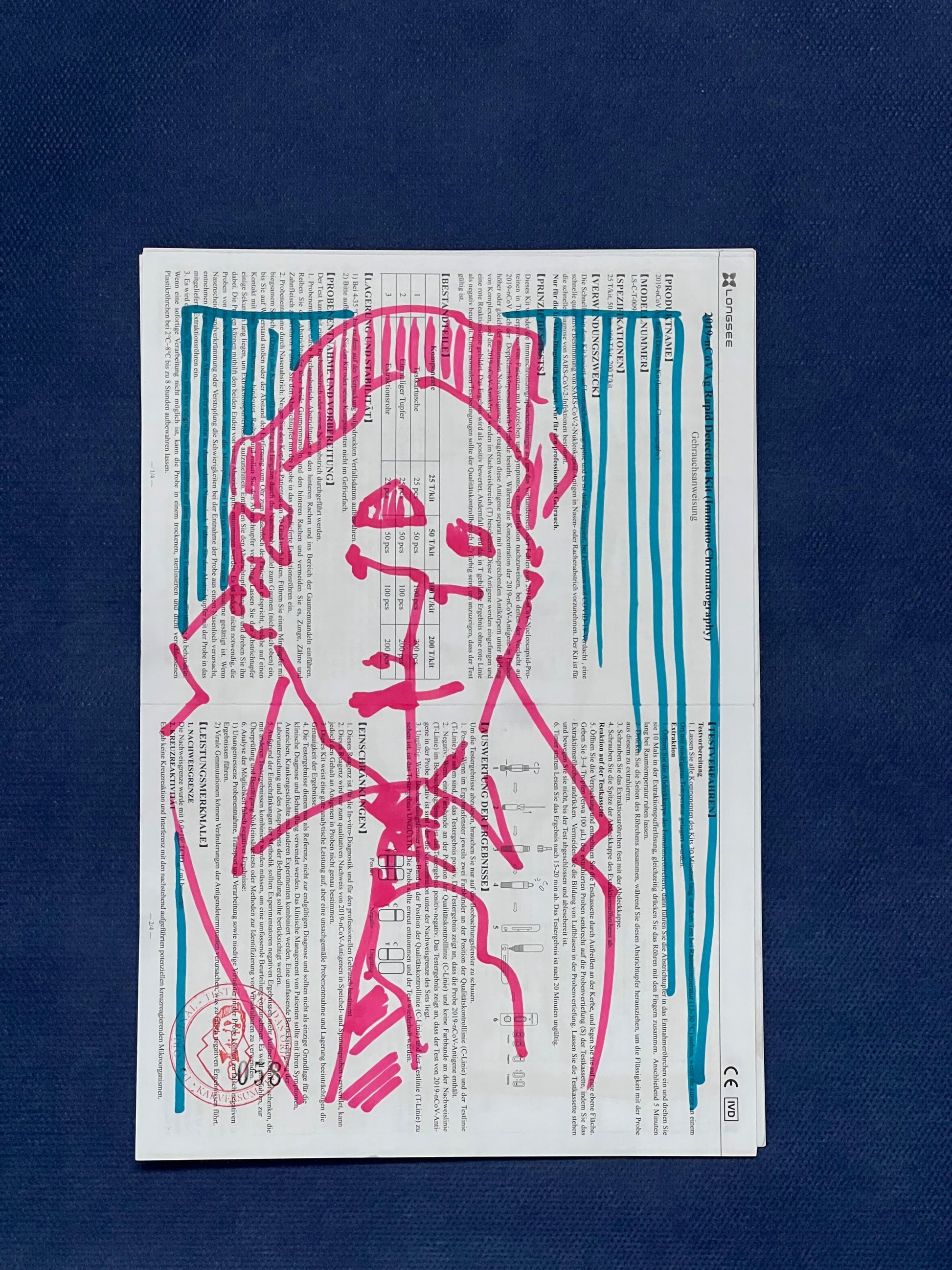 Eine Zeichnung des sich selbst testenden Coronatestmann mit Edding in Pink und Hellblau auf dem Beipackzettel eines Corona-Antigentests. Dieses Original ist signiert sowie datiert im April 2021 und trägt die fortlaufende Nummer 058.