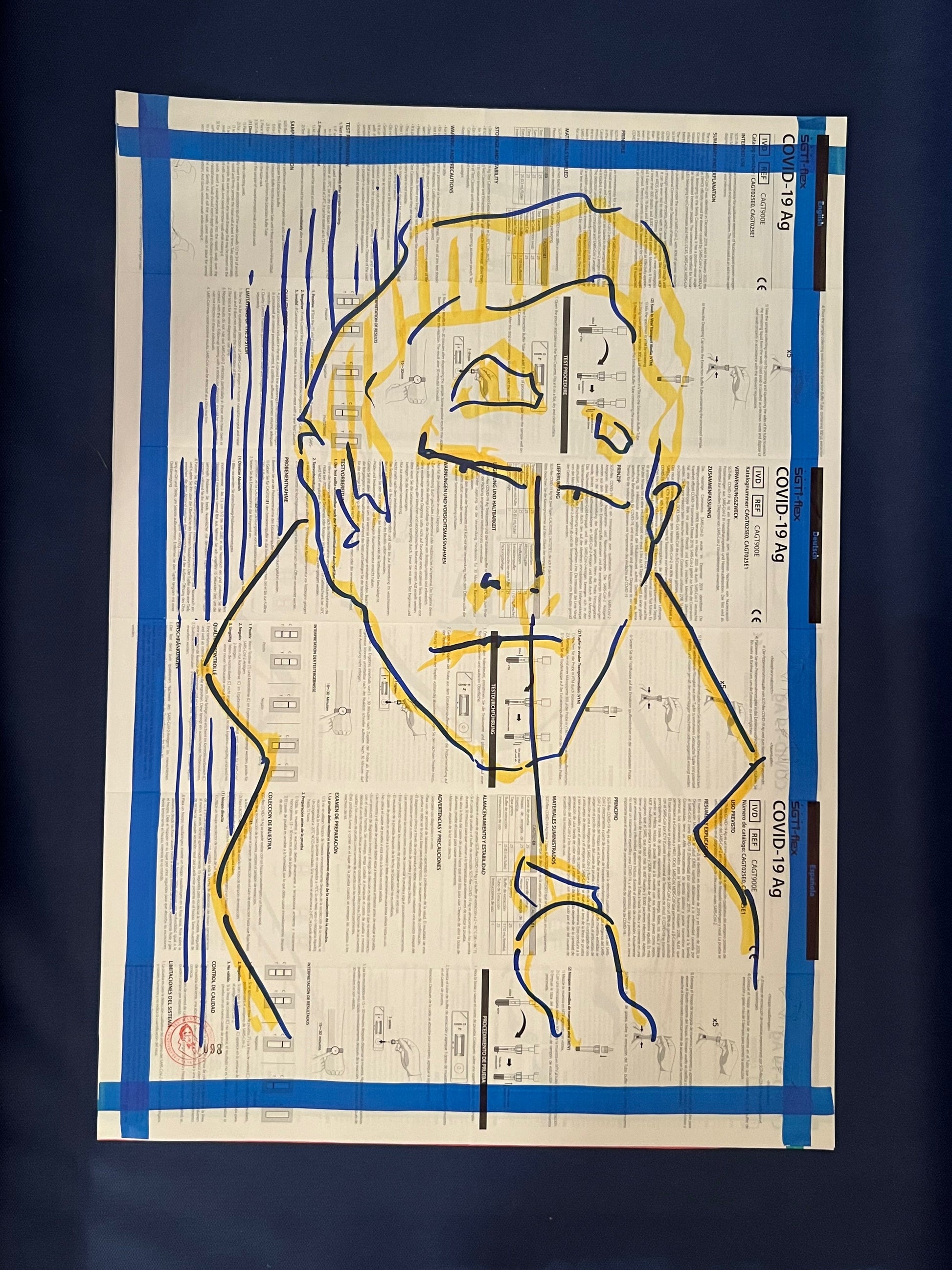 Eine Zeichnung des sich selbst testenden Coronatestmann mit Edding in Dunkelblau und Gelb auf dem Beipackzettel eines Corona-Antigentests. Dieses Original ist signiert sowie datiert im August 2021 und trägt die fortlaufende Nummer 098.