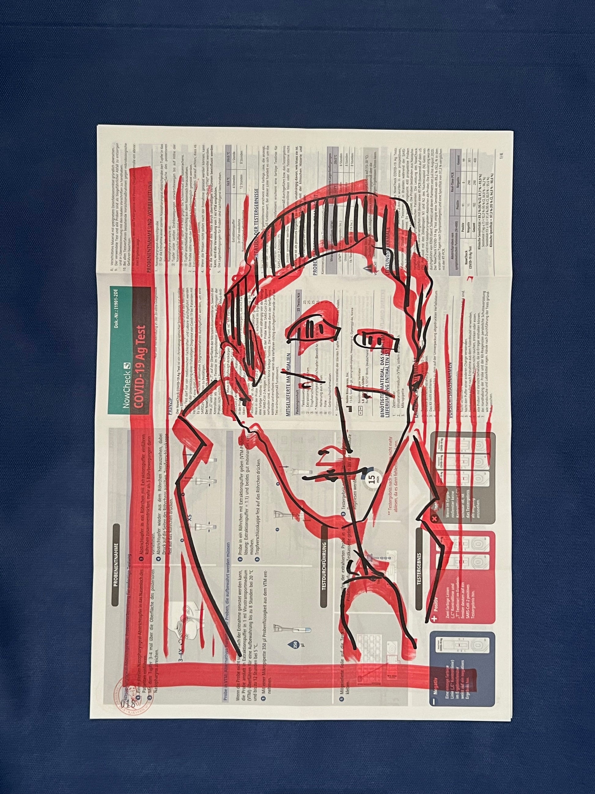 Eine Zeichnung des sich selbst testenden Coronatestmann mit Edding in Rot und Schwarz auf dem Beipackzettel eines Corona-Antigentests. Dieses Original ist signiert sowie datiert im November 2020 und trägt die fortlaufende Nummer 018.