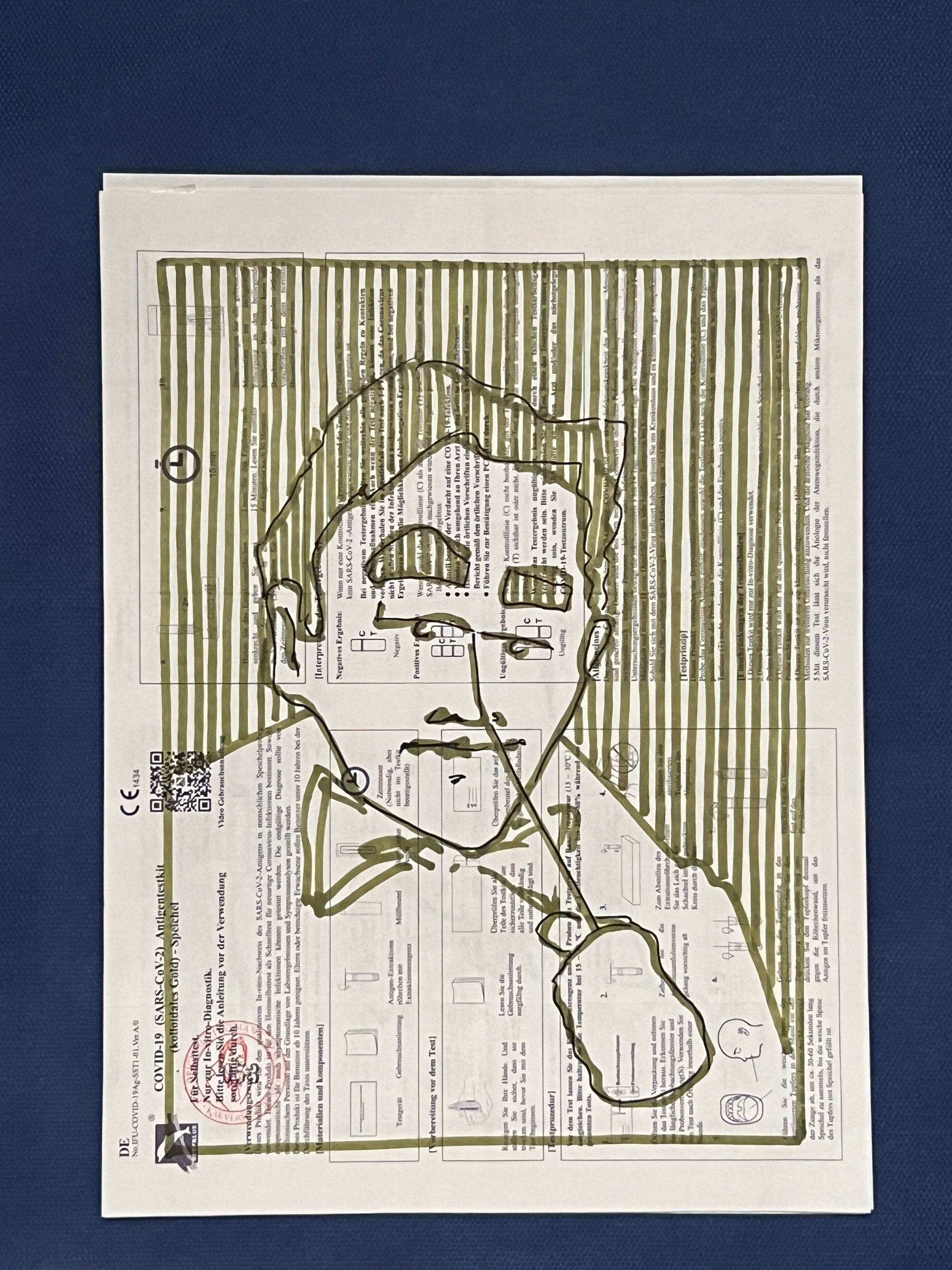 Eine Zeichnung des sich selbst testenden Coronatestmann mit Edding und Fineliner in Olivgrün und Schwarz auf dem Beipackzettel eines Corona-Antigentests. Dieses Original ist signiert sowie datiert im April 2021 und trägt die fortlaufende Nummer 053.