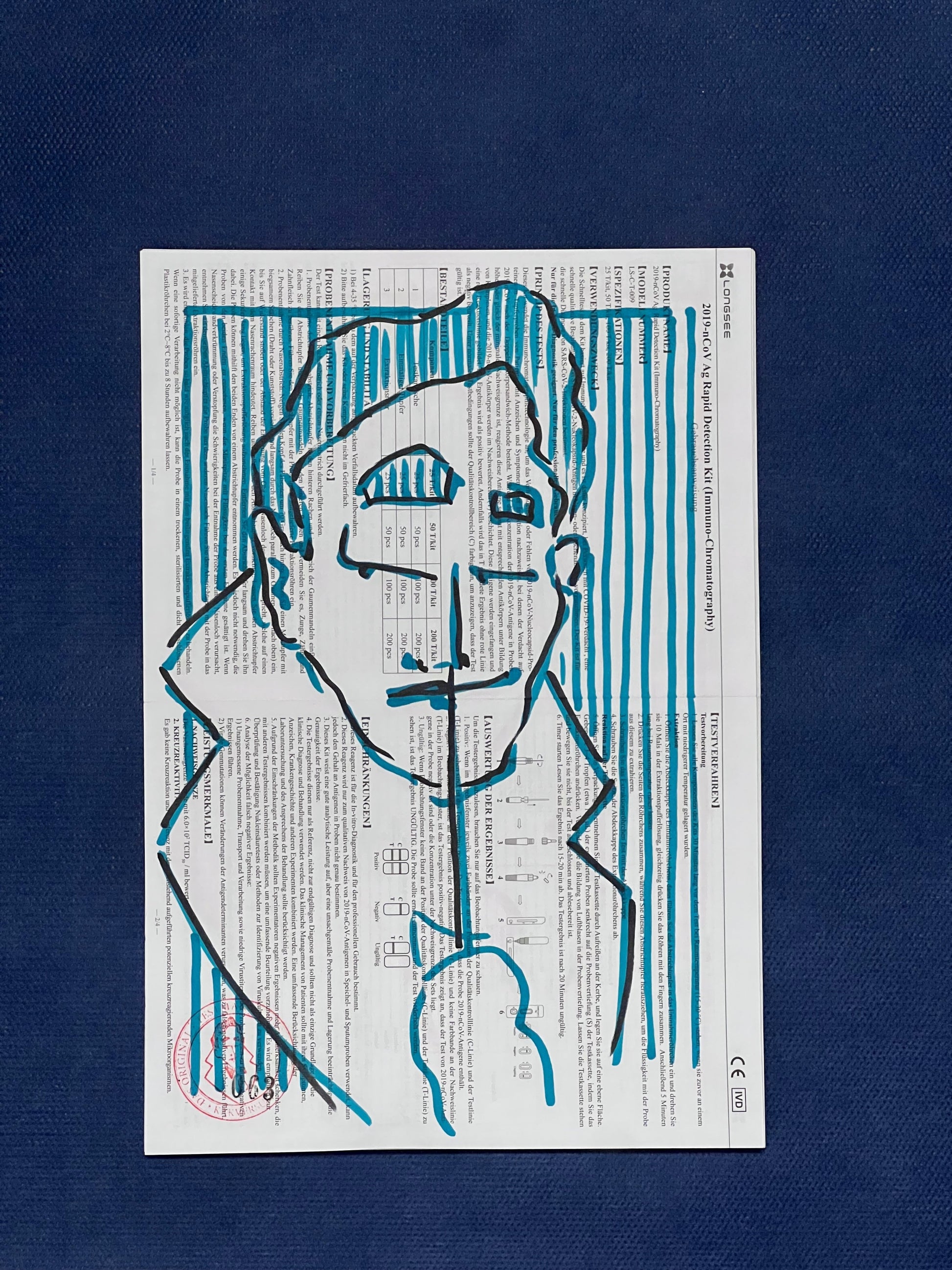 Eine Zeichnung des sich selbst testenden Coronatestmann mit Edding in Hellblau und Schwarz auf dem Beipackzettel eines Corona-Antigentests. Dieses Original ist signiert sowie datiert im April 2021 und trägt die fortlaufende Nummer 063.