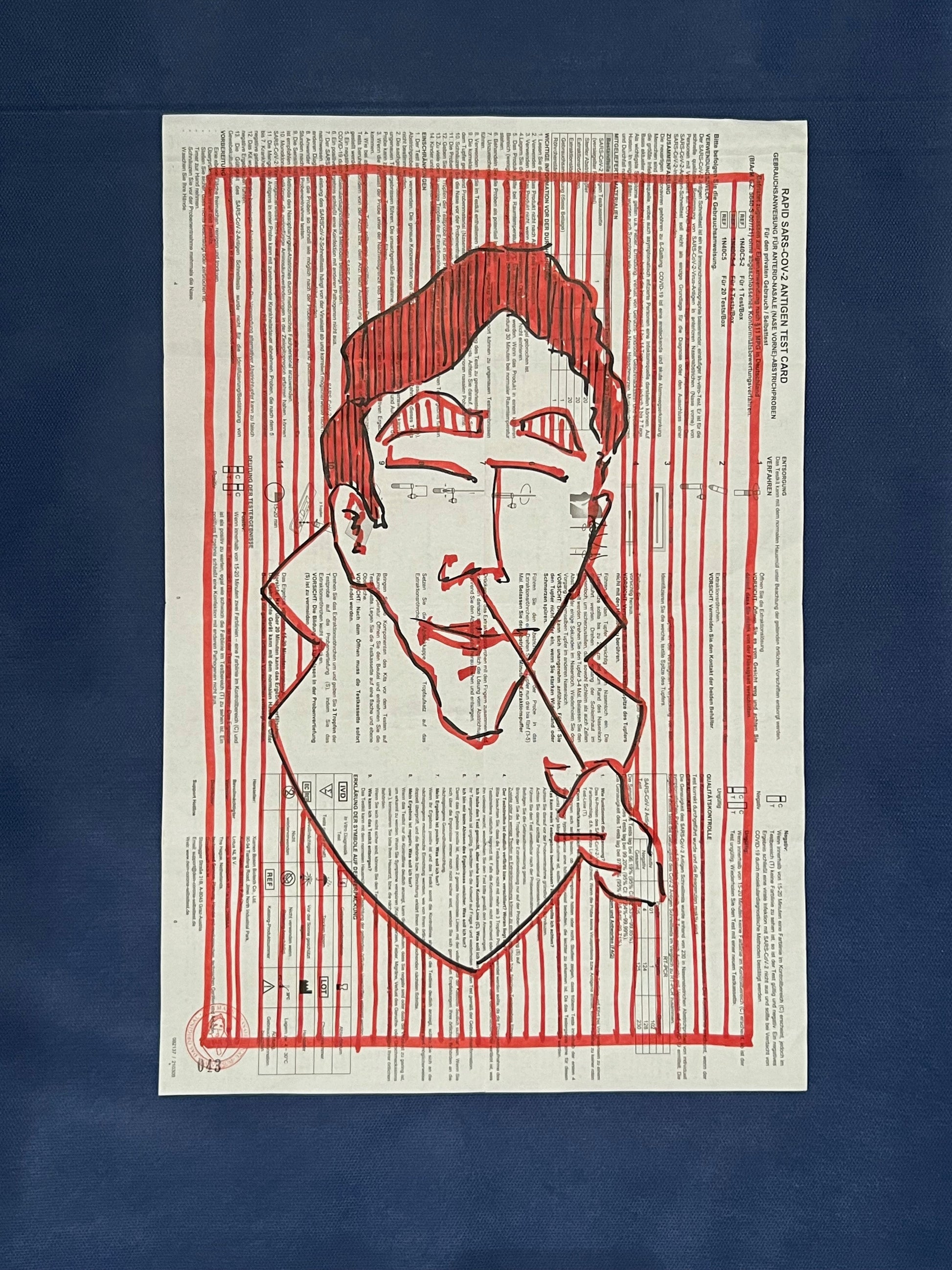 Eine Zeichnung des sich selbst testenden Coronatestmann mit Edding in Rot und Schwarz auf dem Beipackzettel eines Corona-Antigentests. Dieses Original ist signiert sowie datiert im März 2021 und trägt die fortlaufende Nummer 043.