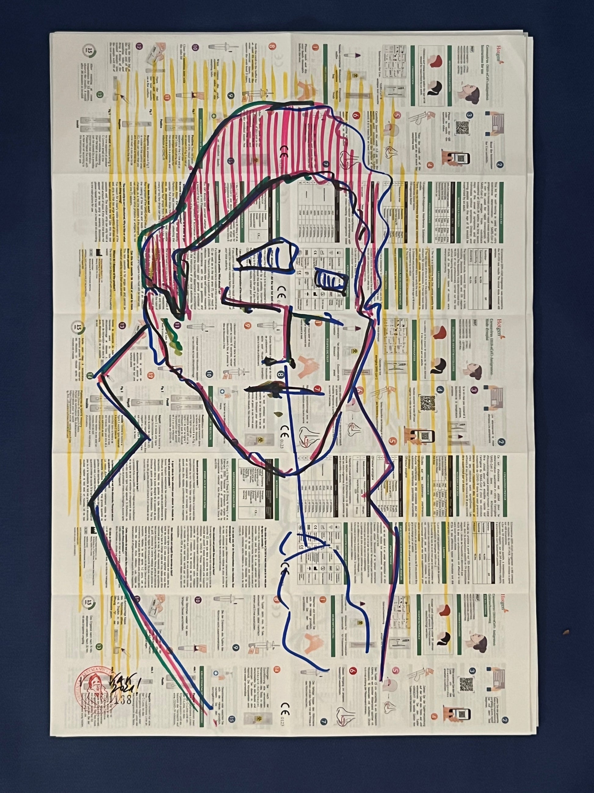 Eine Zeichnung des sich selbst testenden Coronatestmann mit Edding in Gelb, Pink, Dunkelblau, Dunkelgrün, Olivgrün und Schwarz auf dem Beipackzettel eines Corona-Antigentests. Dieses Original ist signiert sowie datiert im September 2020 und trägt die fortlaufende Nummer 138.