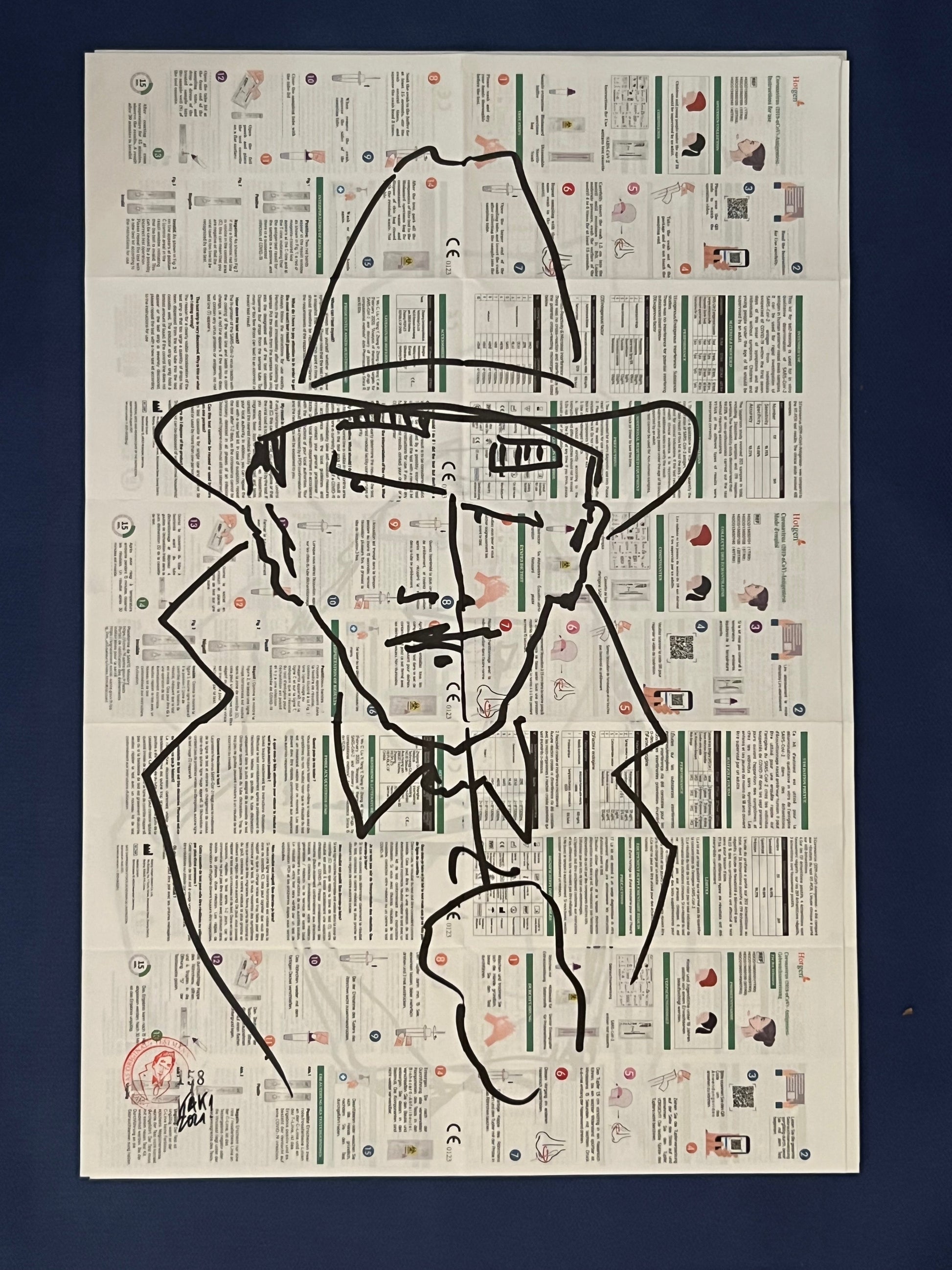 Eine Zeichnung des sich selbst testenden Coronatestmann mit Edding in Schwarz auf dem Beipackzettel eines Corona-Antigentests. Dieses Original ist signiert sowie datiert im September 2020 und trägt die fortlaufende Nummer 158.