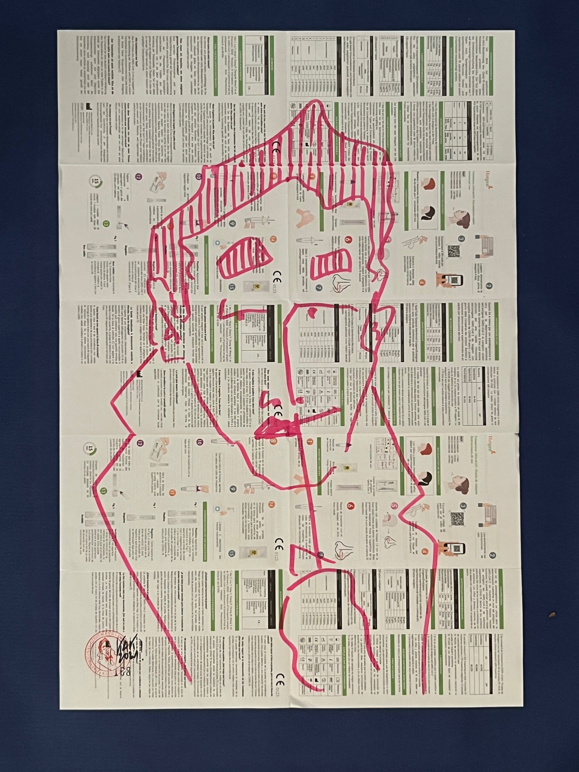 Eine Zeichnung des sich selbst testenden Coronatestmann mit Edding in Pink auf dem Beipackzettel eines Corona-Antigentests. Dieses Original ist signiert sowie datiert im September 2020 und trägt die fortlaufende Nummer 168.