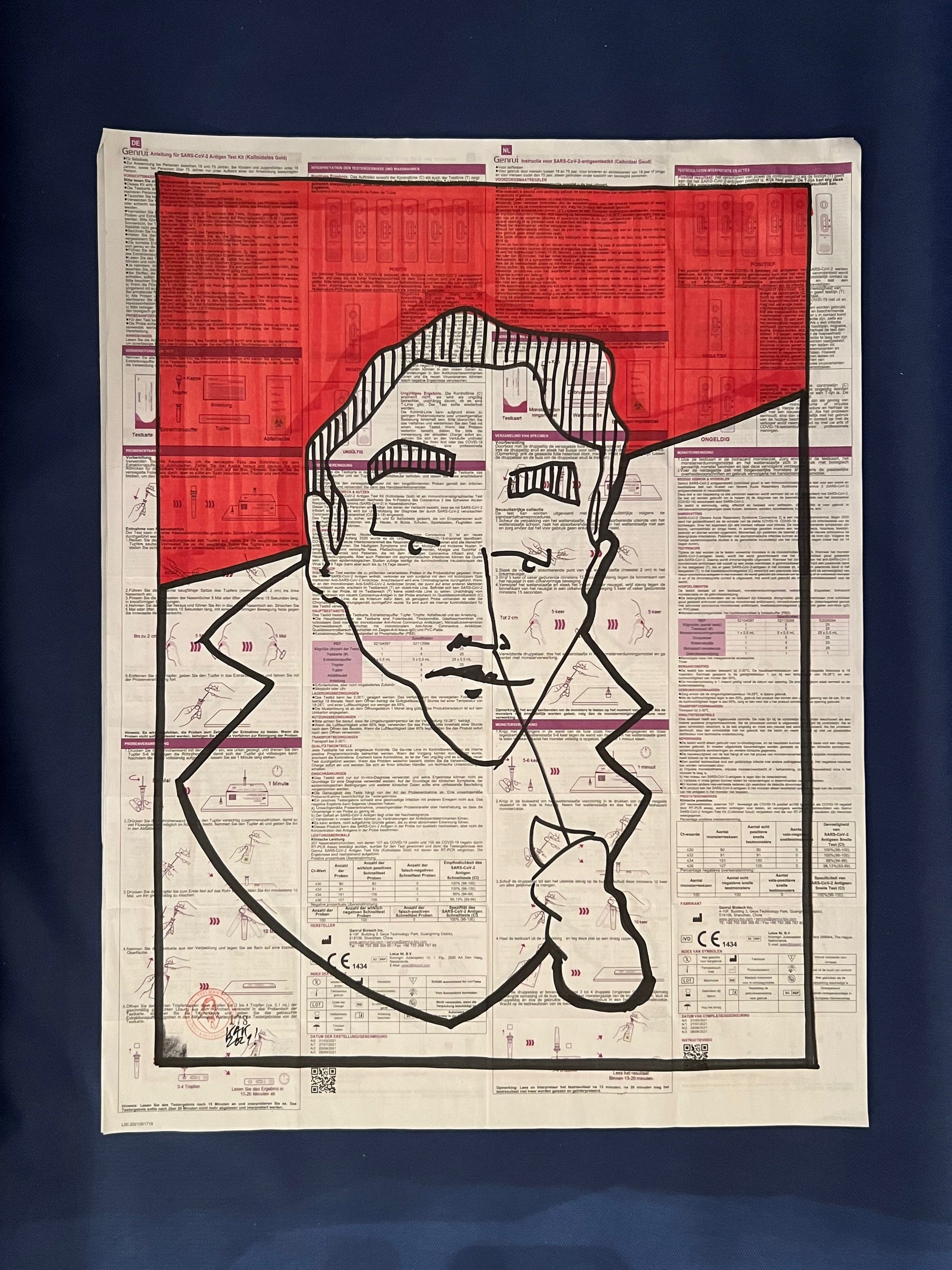 Eine Zeichnung des sich selbst testenden Coronatestmann mit Edding in Rot und Schwarz auf dem Beipackzettel eines Corona-Antigentests. Dieses Original ist signiert sowie datiert im August 2021 und trägt die fortlaufende Nummer 178.