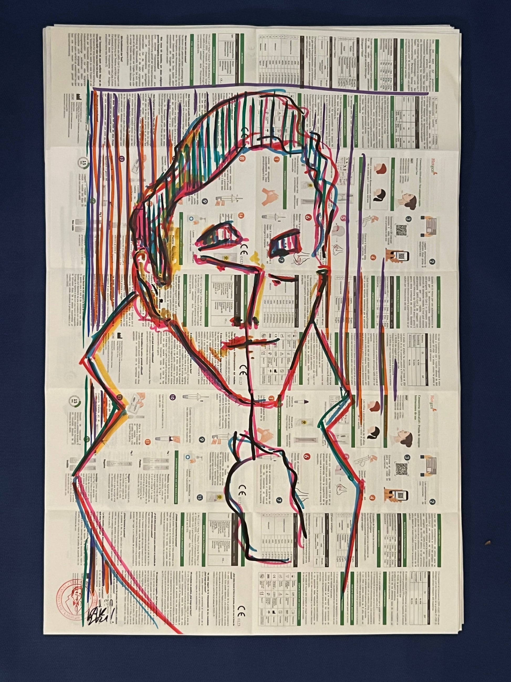 Eine Zeichnung des sich selbst testenden Coronatestmann mit Edding in Gelb, Orange, Rot, Pink, Lila, Hellblau, Dunkelblau, Dunkelgrün und Schwarz auf dem Beipackzettel eines Corona-Antigentests. Dieses Original ist signiert sowie datiert im September 2020 und trägt die fortlaufende Nummer 130.