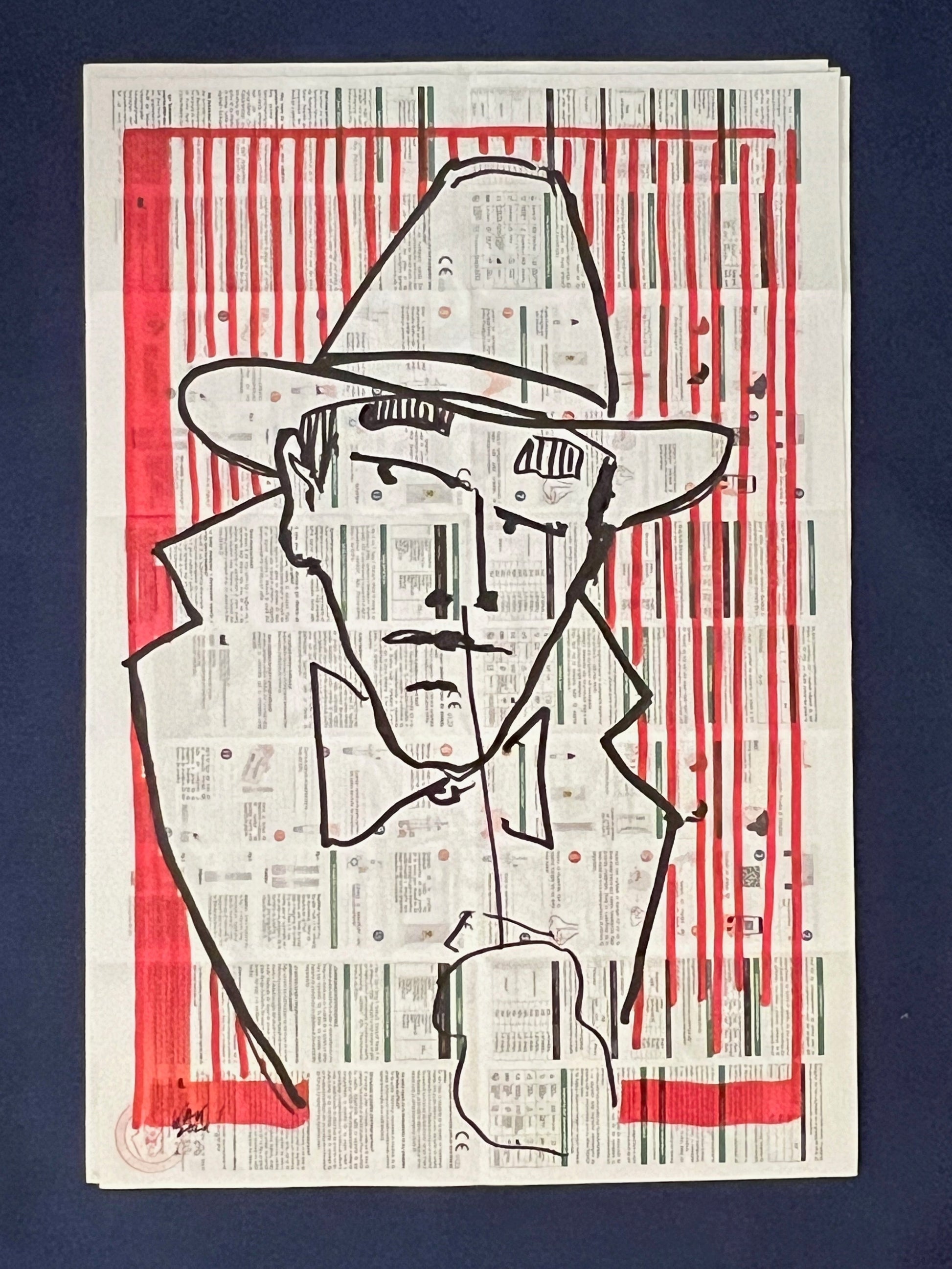 Eine Zeichnung des sich selbst testenden Coronatestmann mit Edding in Rot und Schwarz auf dem Beipackzettel eines Corona-Antigentests. Dieses Original ist signiert sowie datiert im September 2020 und trägt die fortlaufende Nummer 153.