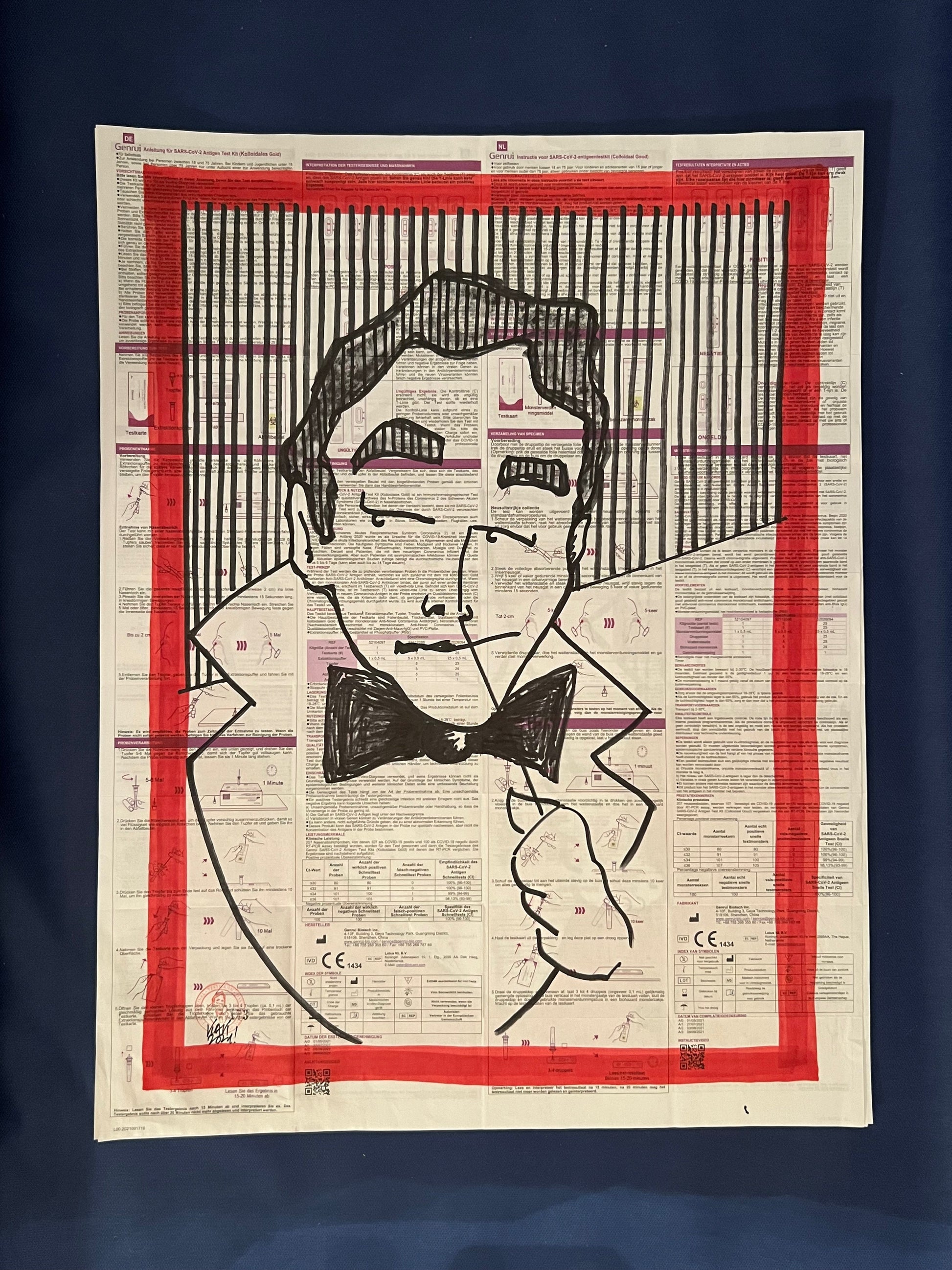 Eine Zeichnung des sich selbst testenden Coronatestmann mit Edding in Rot und Schwarz auf dem Beipackzettel eines Corona-Antigentests. Dieses Original ist signiert sowie datiert im August 2021 und trägt die fortlaufende Nummer 173.