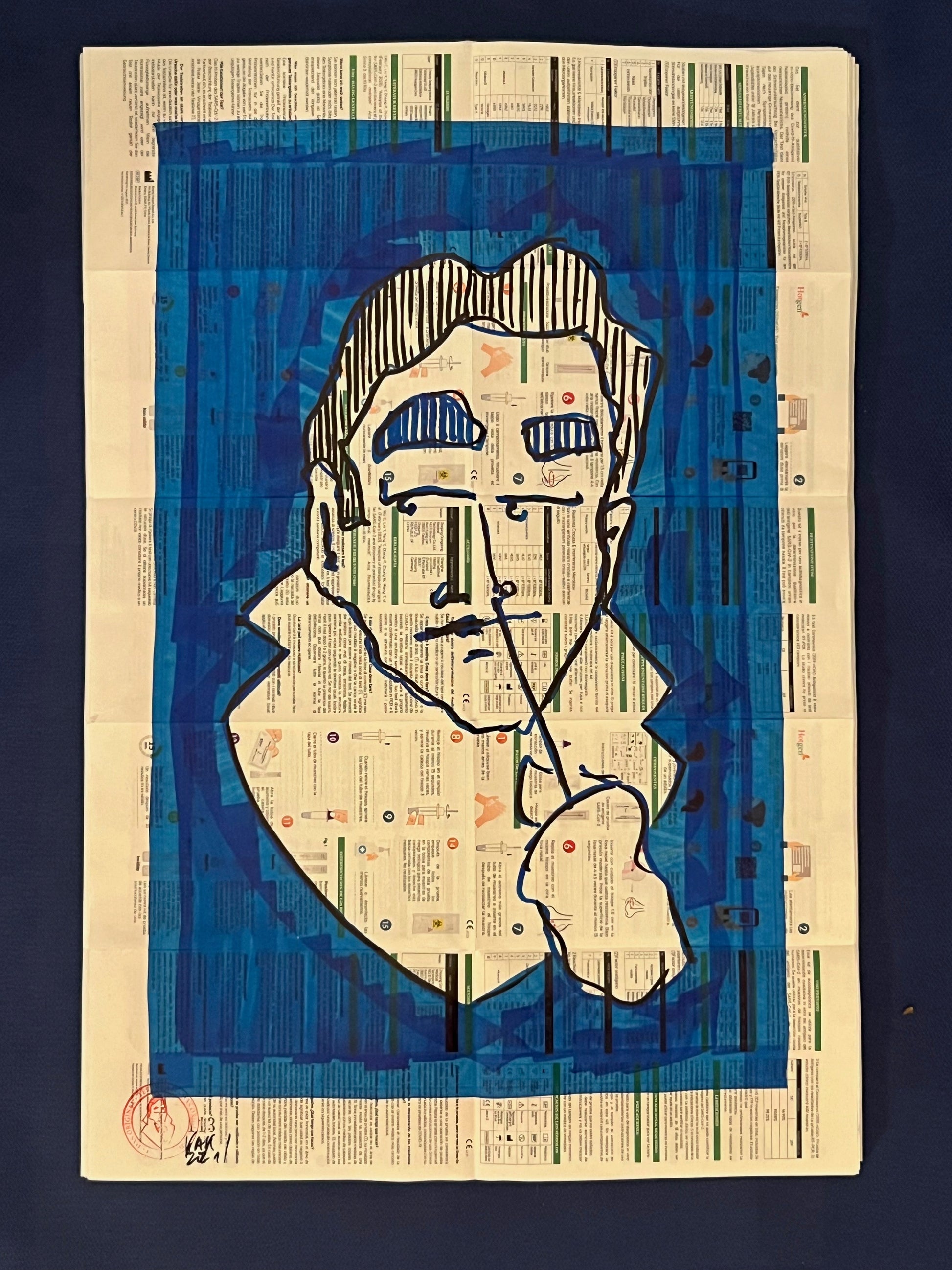 Eine Zeichnung des sich selbst testenden Coronatestmann mit Edding in Dunkelblau und Schwarz auf dem Beipackzettel eines Corona-Antigentests. Dieses Original ist signiert sowie datiert im September 2020 und trägt die fortlaufende Nummer 113.
