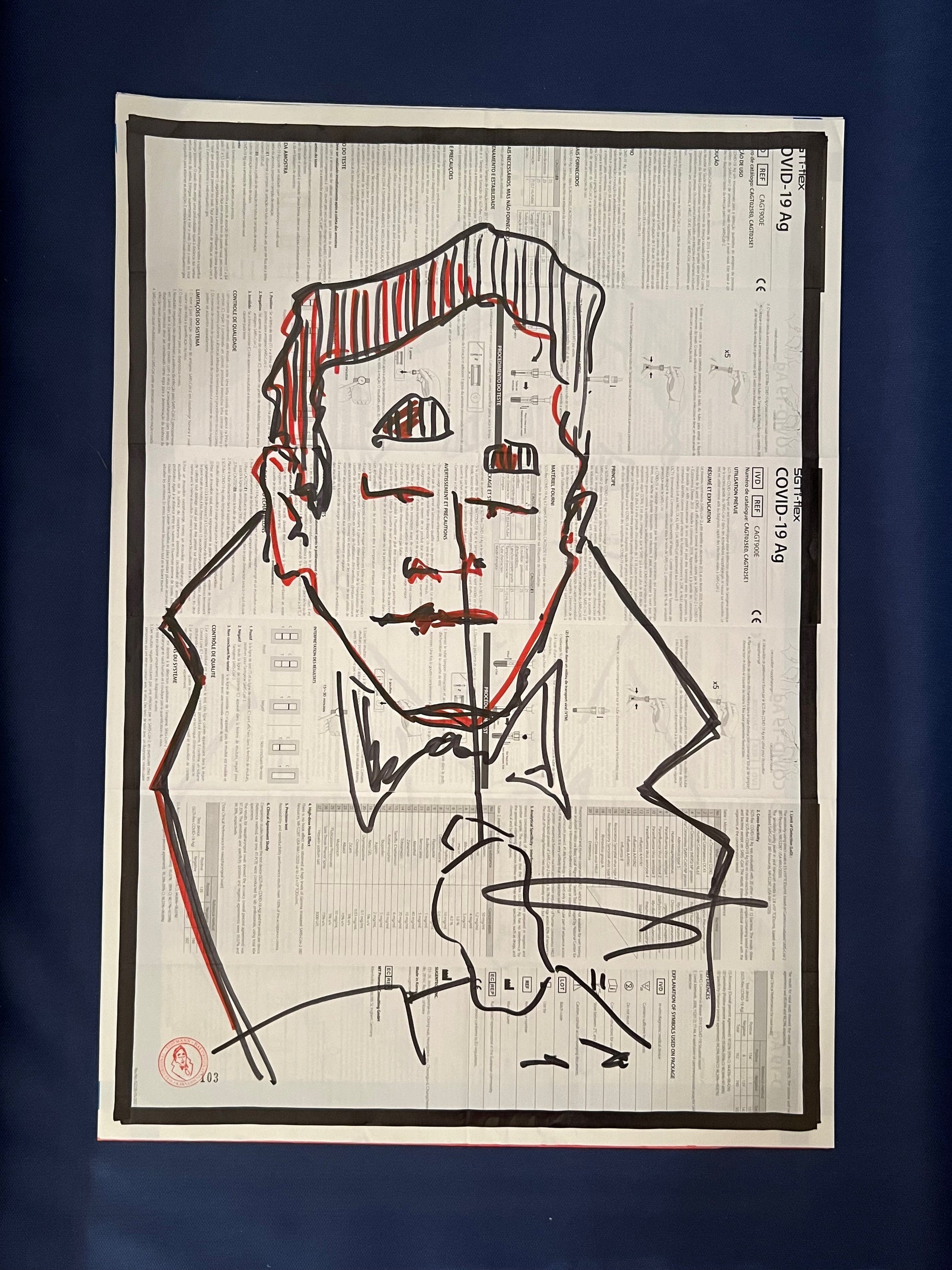 Eine Zeichnung des sich selbst testenden Coronatestmann mit Edding in Rot und Schwarz auf dem Beipackzettel eines Corona-Antigentests. Dieses Original ist signiert sowie datiert im August 2021 und trägt die fortlaufende Nummer 103.