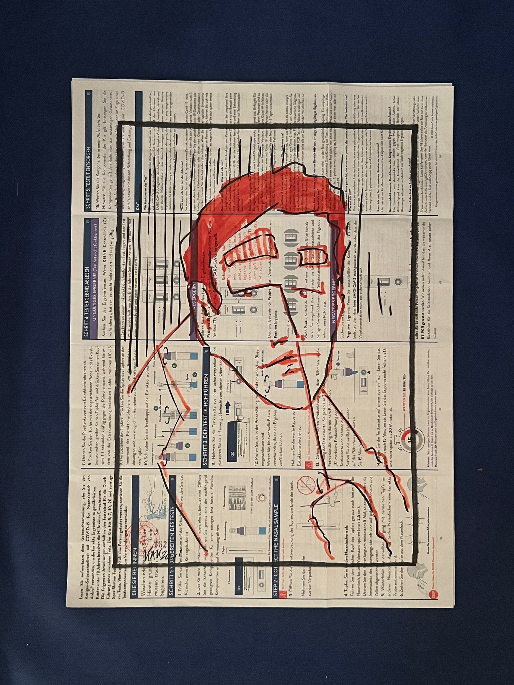 Eine Zeichnung des sich selbst testenden Coronatestmann mit Edding in Gelb, Orange und Schwarz auf dem Beipackzettel eines Corona-Antigentests. Dieses Original ist signiert sowie datiert im Oktober 2021 und trägt die fortlaufende Nummer 181.