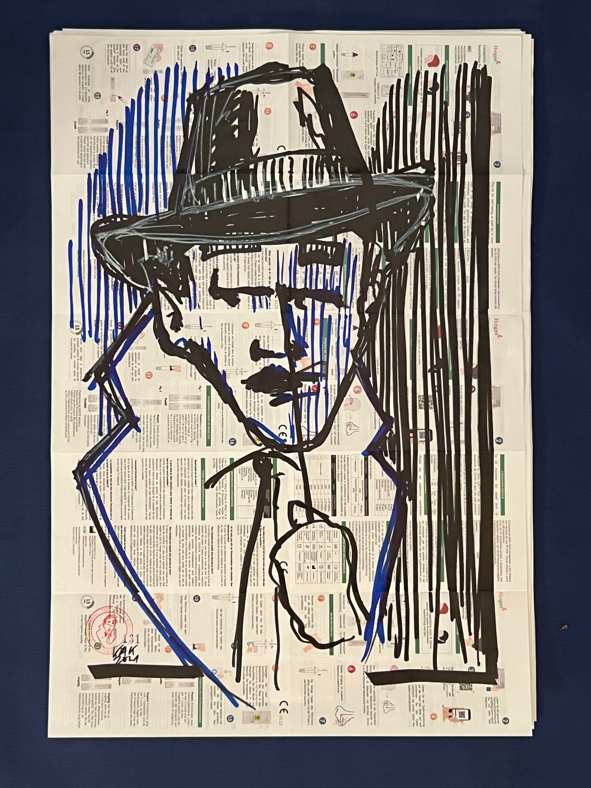 Eine Zeichnung des sich selbst testenden Coronatestmann mit Edding und Lackstift in Weiß, Schwarz und Dunkelblau auf dem Beipackzettel eines Corona-Antigentests. Dieses Original ist signiert sowie datiert im September 2020 und trägt die fortlaufende Nummer 131.