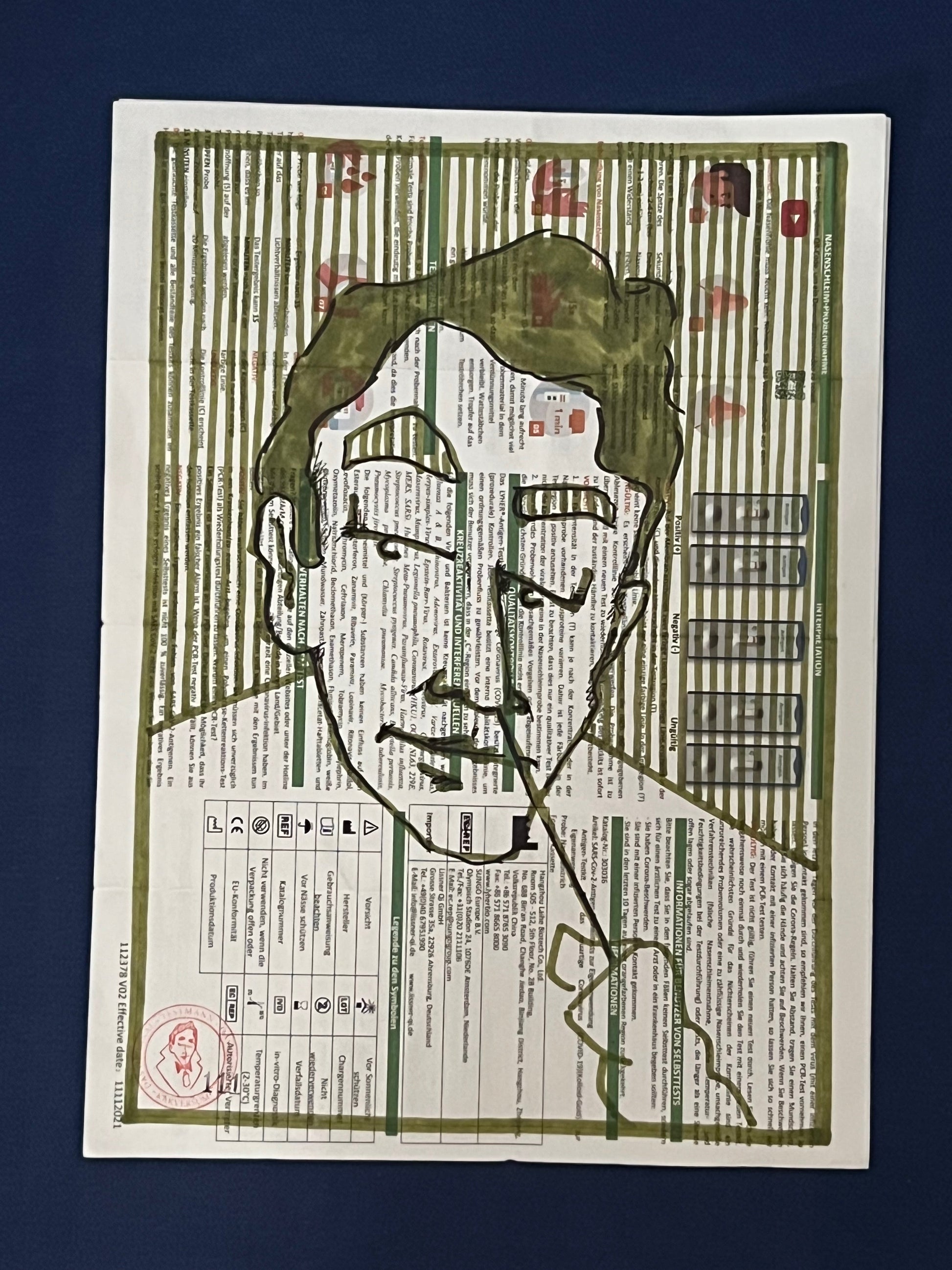 Eine Zeichnung des sich selbst testenden Coronatestmann mit Edding in Olivgrün und Schwarz auf dem Beipackzettel eines Corona-Antigentests. Dieses Original ist signiert sowie datiert im August 2021 und trägt die fortlaufende Nummer 111.