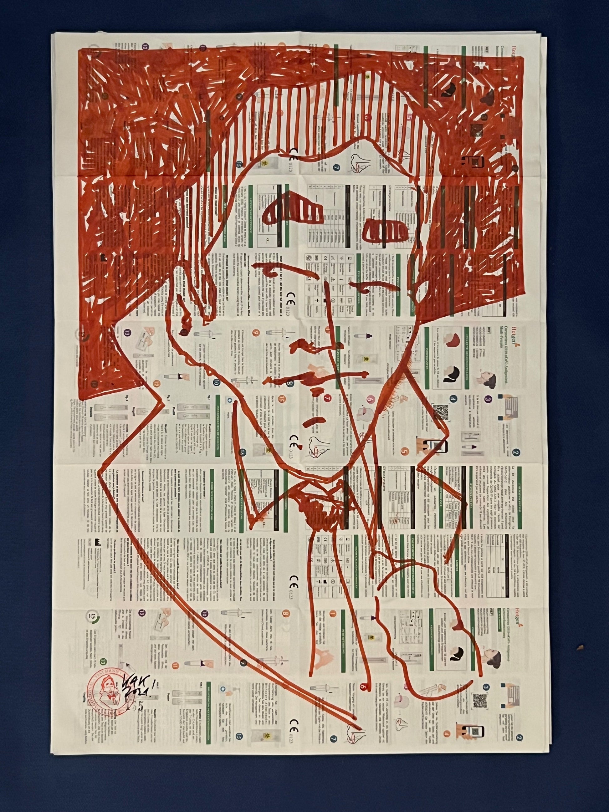 Eine Zeichnung des sich selbst testenden Coronatestmann mit Edding in Braun auf dem Beipackzettel eines Corona-Antigentests. Dieses Original ist signiert sowie datiert im September 2020 und trägt die fortlaufende Nummer 135.