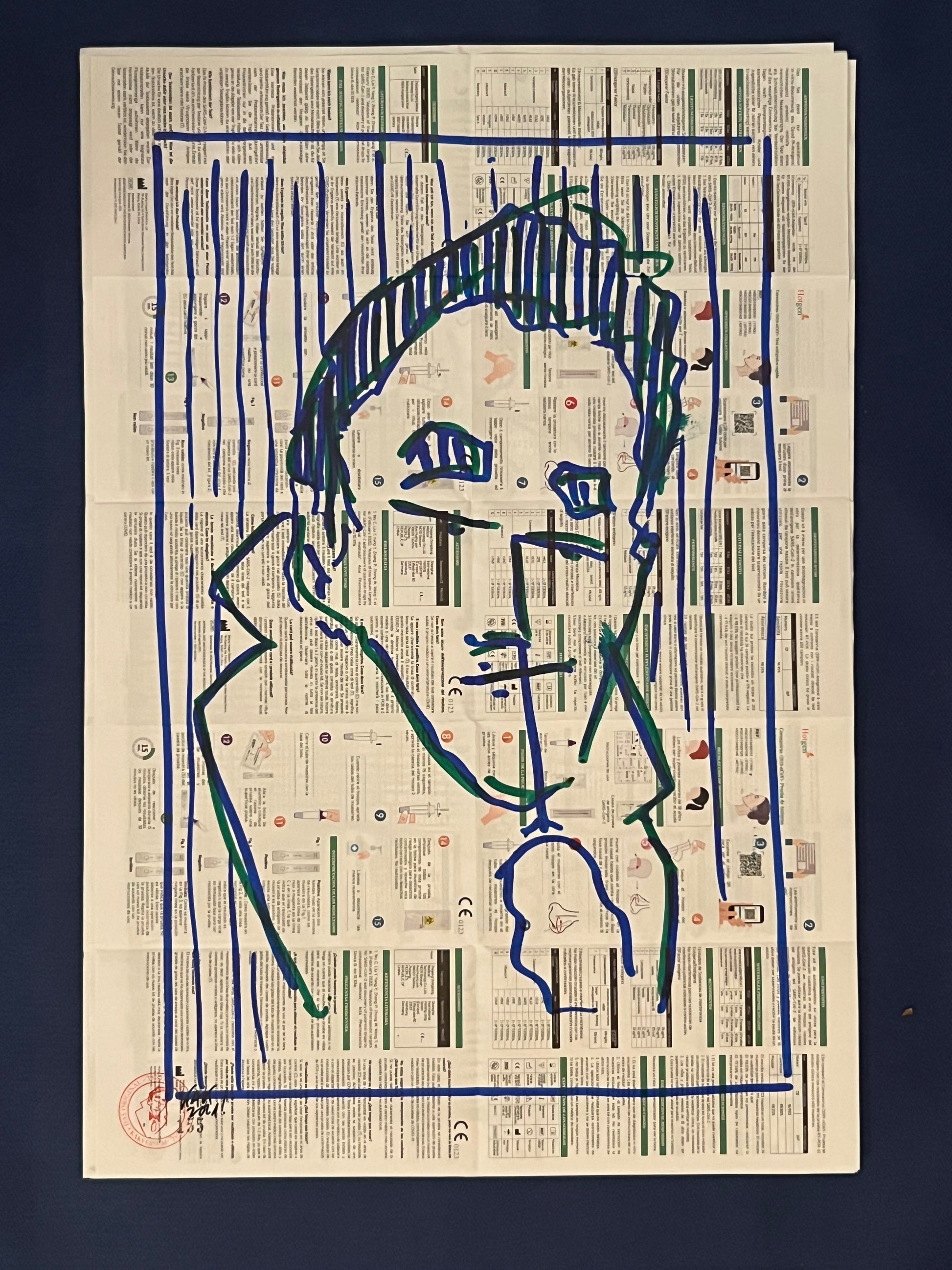 Eine Zeichnung des sich selbst testenden Coronatestmann mit Edding in Dunkelblau und Dunkelgrün auf dem Beipackzettel eines Corona-Antigentests. Dieses Original ist signiert sowie datiert im September 2020 und trägt die fortlaufende Nummer 155.