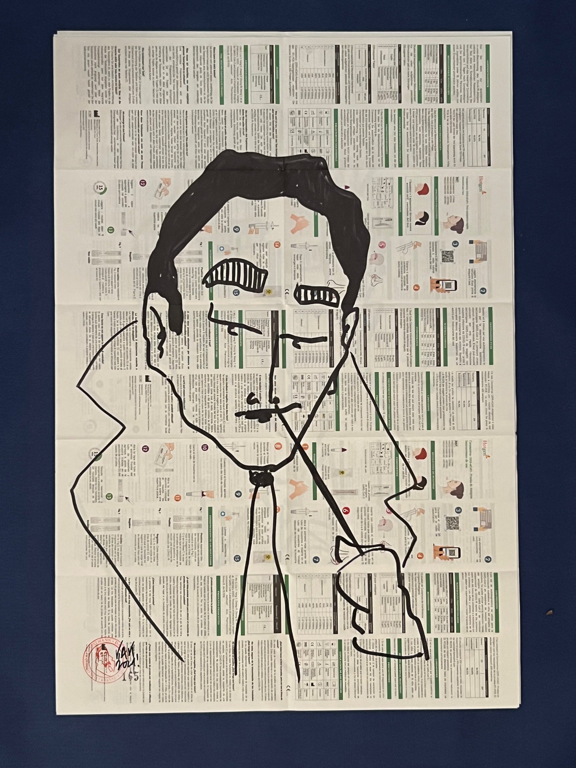 Eine Zeichnung des sich selbst testenden Coronatestmann mit Edding in Schwarz auf dem Beipackzettel eines Corona-Antigentests. Dieses Original ist signiert sowie datiert im September 2020 und trägt die fortlaufende Nummer 165.