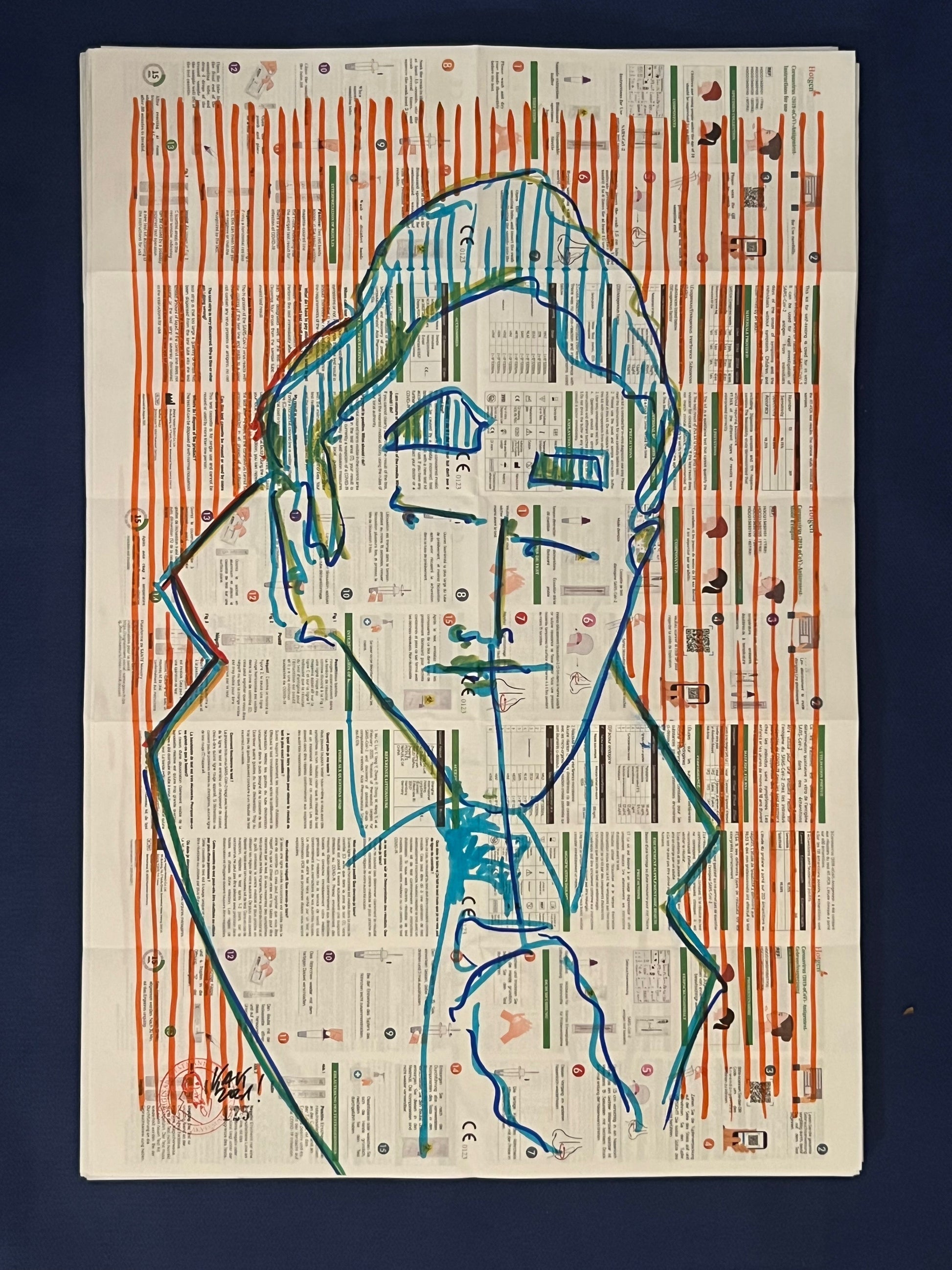 Eine Zeichnung des sich selbst testenden Coronatestmann mit Edding in Orange, Olivgrün, Dunkelblau und Hellblau auf dem Beipackzettel eines Corona-Antigentests. Dieses Original ist signiert sowie datiert im September 2020 und trägt die fortlaufende Nummer 125.