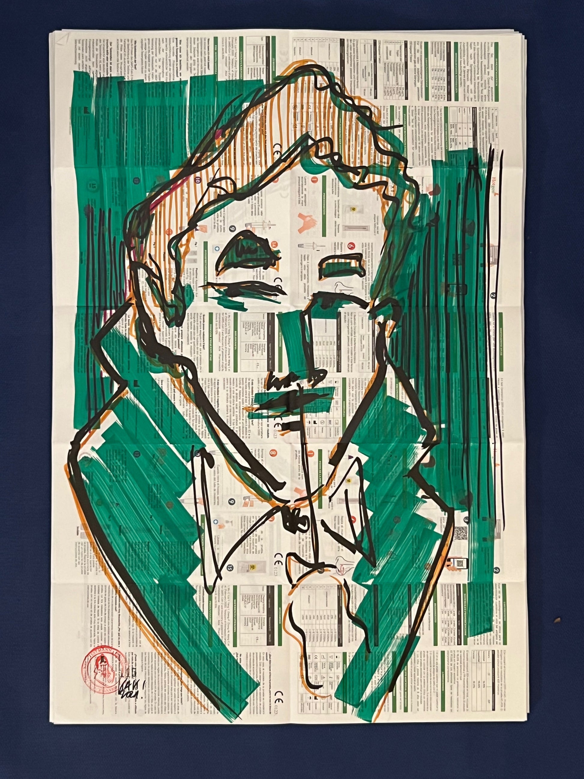 Eine Zeichnung des sich selbst testenden Coronatestmann mit Edding in Hellbraun, Dunkelgrün und Schwarz auf dem Beipackzettel eines Corona-Antigentests. Dieses Original ist signiert sowie datiert im September 2020 und trägt die fortlaufende Nummer 115.
