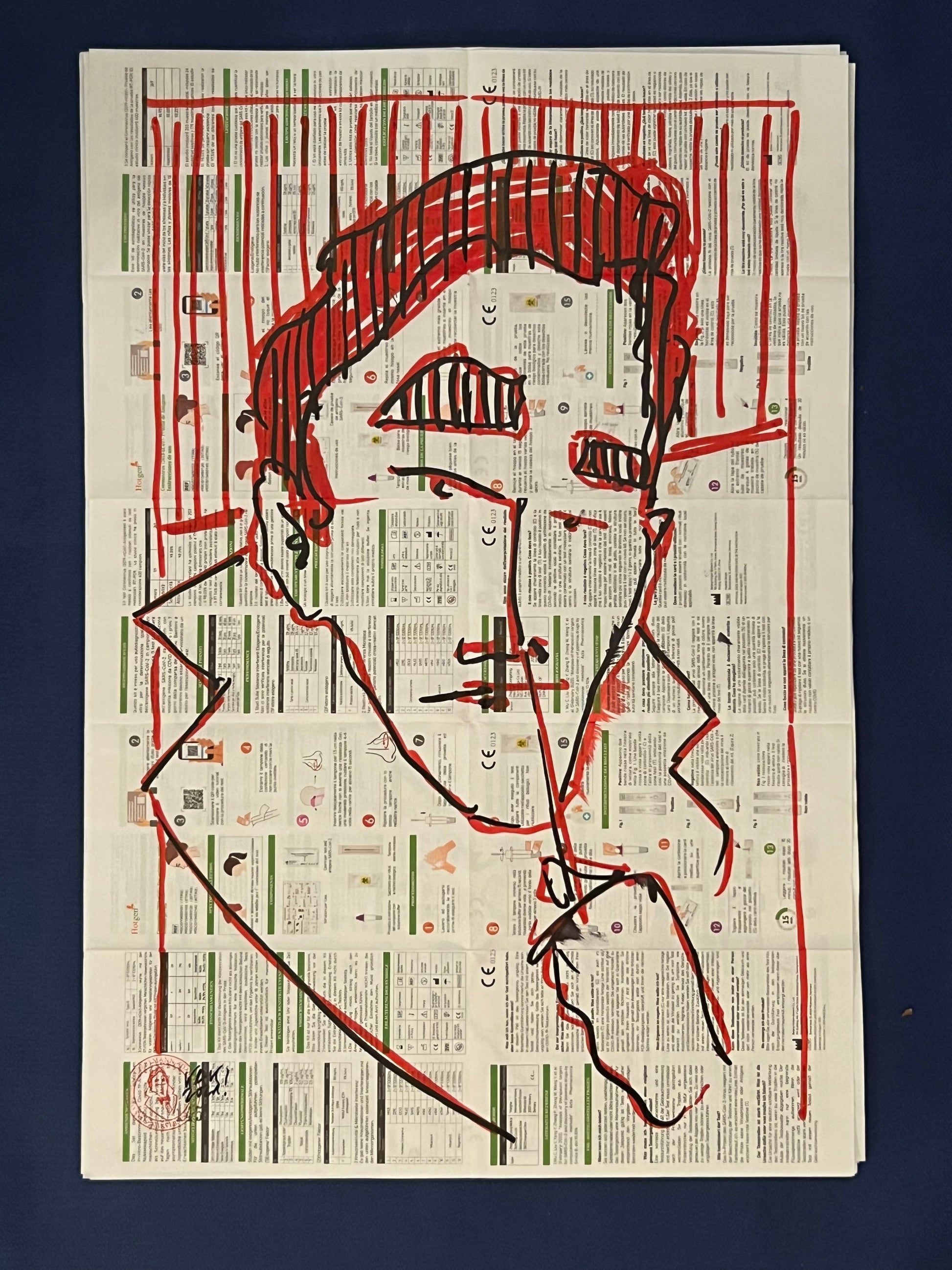 Eine Zeichnung des sich selbst testenden Coronatestmann mit Edding in Rot und Schwarz auf dem Beipackzettel eines Corona-Antigentests. Dieses Original ist signiert sowie datiert im September 2020 und trägt die fortlaufende Nummer 145.