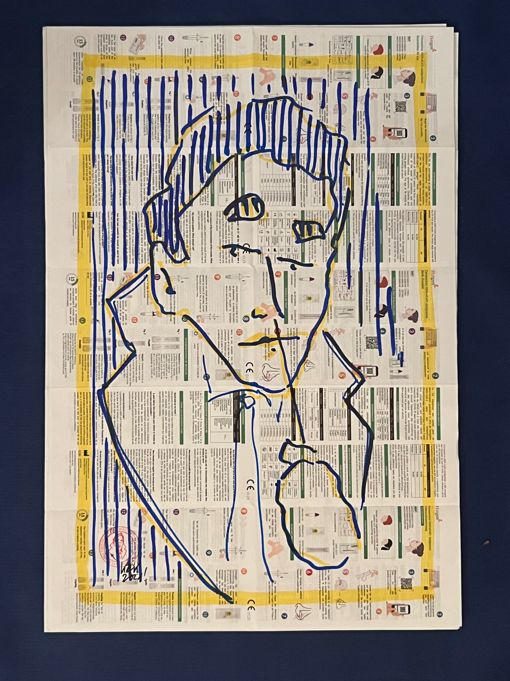 Eine Zeichnung des sich selbst testenden Coronatestmann mit Edding in Gelb und Dunkelblau auf dem Beipackzettel eines Corona-Antigentests. Dieses Original ist signiert sowie datiert im September 2020 und trägt die fortlaufende Nummer 150.