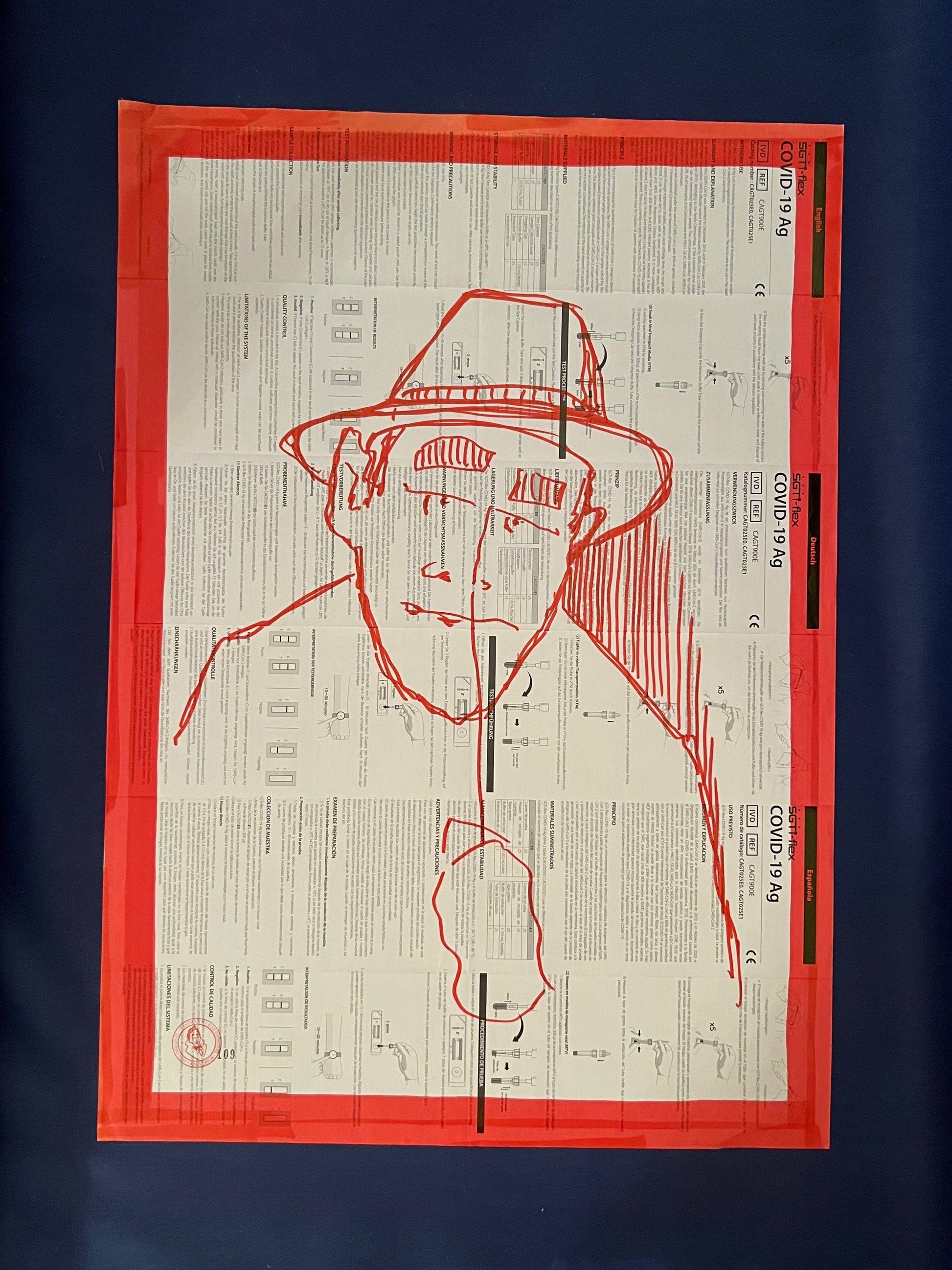 Eine Zeichnung des sich selbst testenden Coronatestmann mit Edding in Rot auf dem Beipackzettel eines Corona-Antigentests. Dieses Original ist signiert sowie datiert im August 2021 und trägt die fortlaufende Nummer 109.