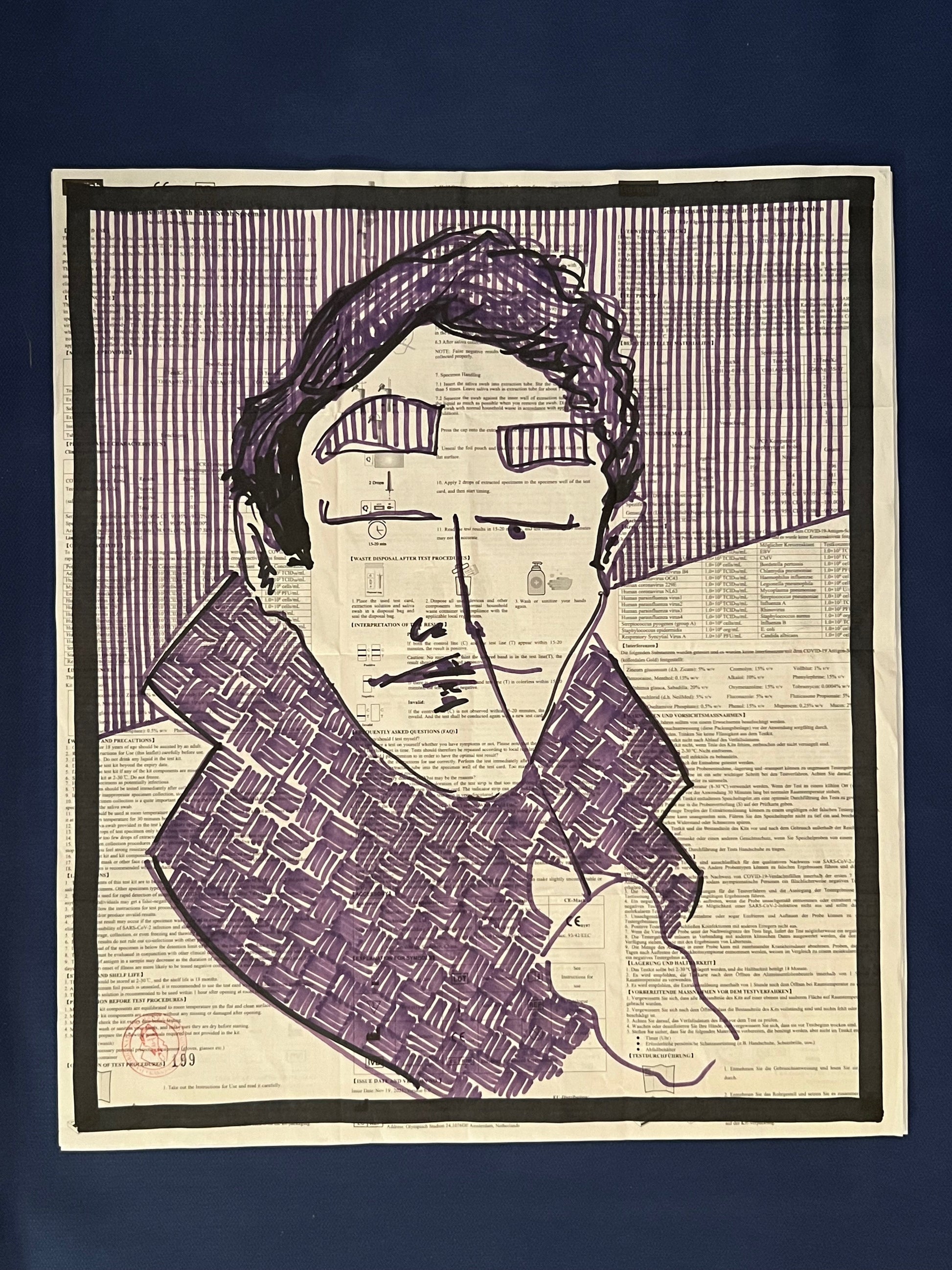 Eine Zeichnung des sich selbst testenden Coronatestmann mit Edding in Lila und Schwarz auf dem Beipackzettel eines Corona-Antigentests. Dieses Original ist signiert sowie datiert im November 2021 und trägt die fortlaufende Nummer 199.