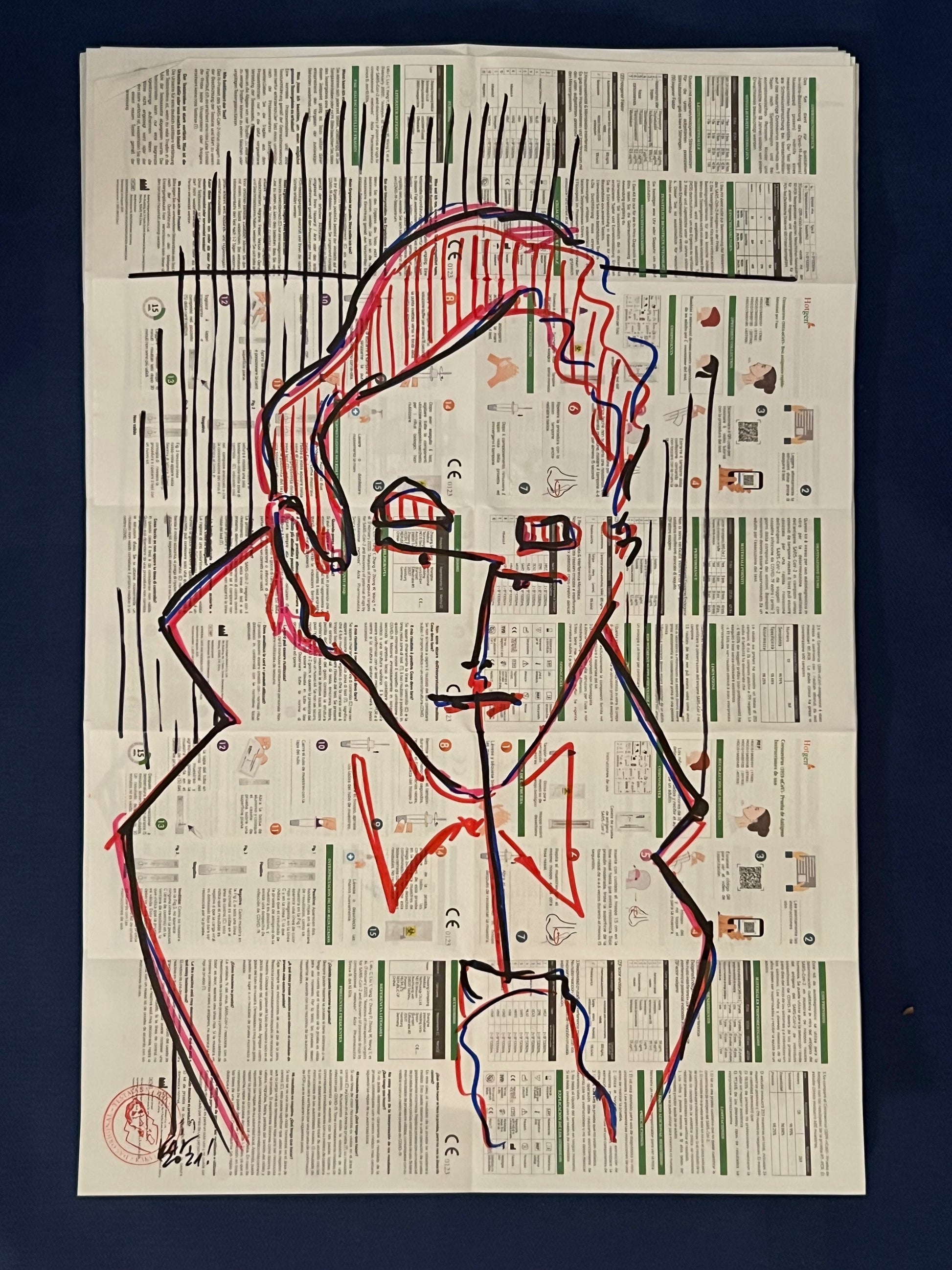 Eine Zeichnung des sich selbst testenden Coronatestmann mit Edding in Rot, Pink, Dunkelblau und Schwarz auf dem Beipackzettel eines Corona-Antigentests. Dieses Original ist signiert sowie datiert im September 2020 und trägt die fortlaufende Nummer 119.