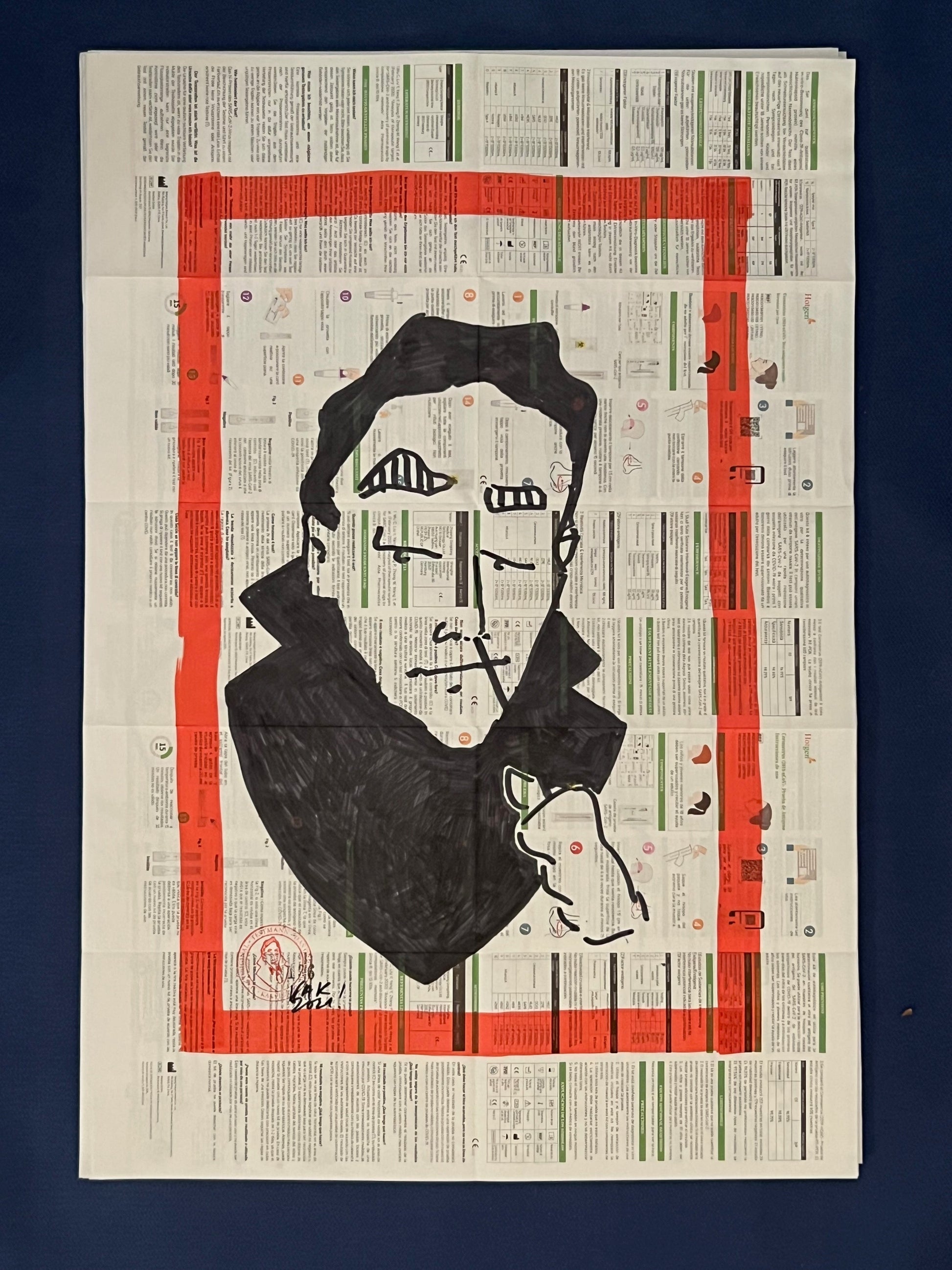Eine Zeichnung des sich selbst testenden Coronatestmann mit Edding in Rot und Schwarz auf dem Beipackzettel eines Corona-Antigentests. Dieses Original ist signiert sowie datiert im September 2020 und trägt die fortlaufende Nummer 136.