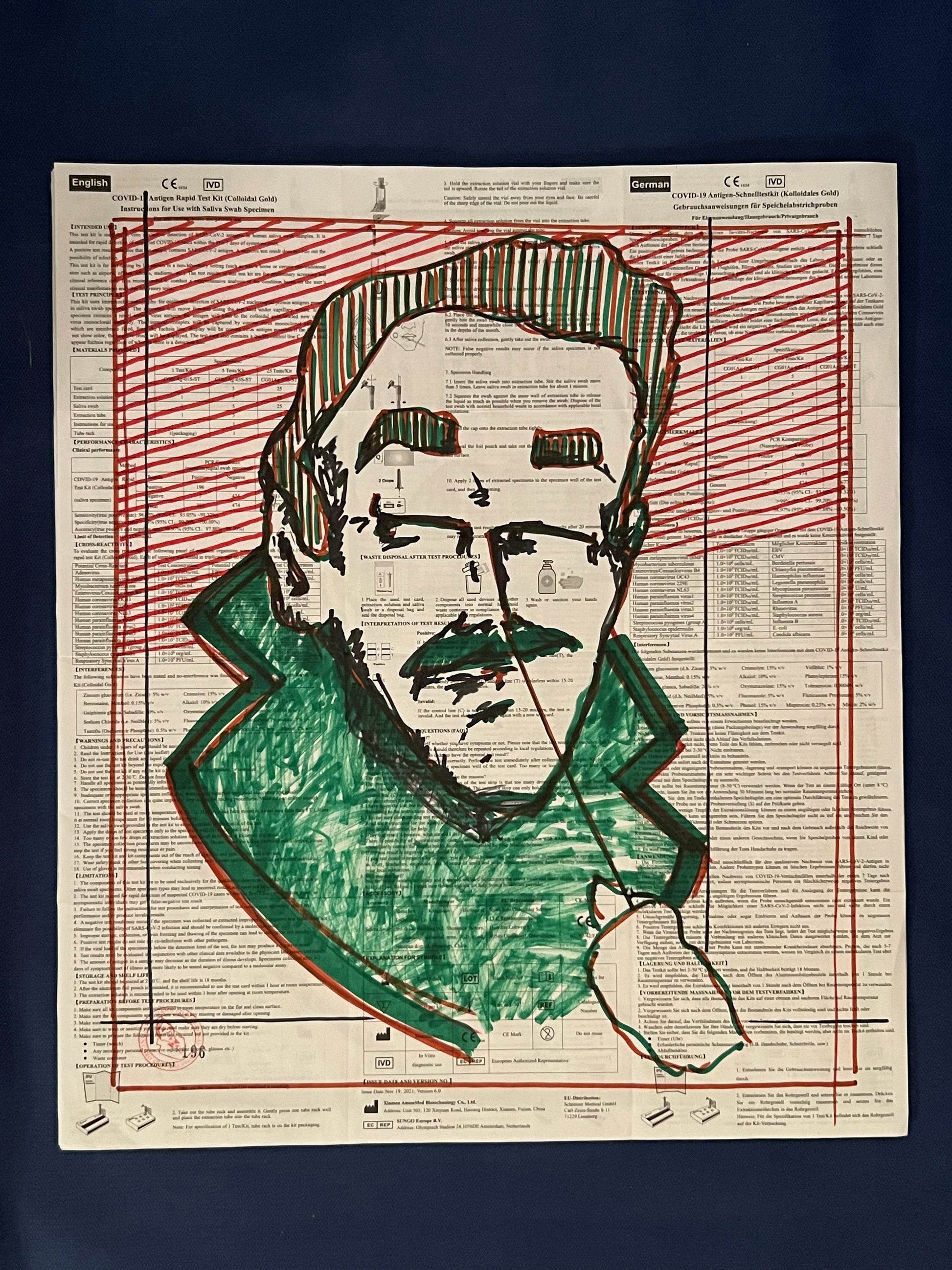 Eine Zeichnung des sich selbst testenden Coronatestmann mit Edding in Rot, Braun, Dunkelgrün und Schwarz auf dem Beipackzettel eines Corona-Antigentests. Dieses Original ist signiert sowie datiert im November 2021 und trägt die fortlaufende Nummer 196.