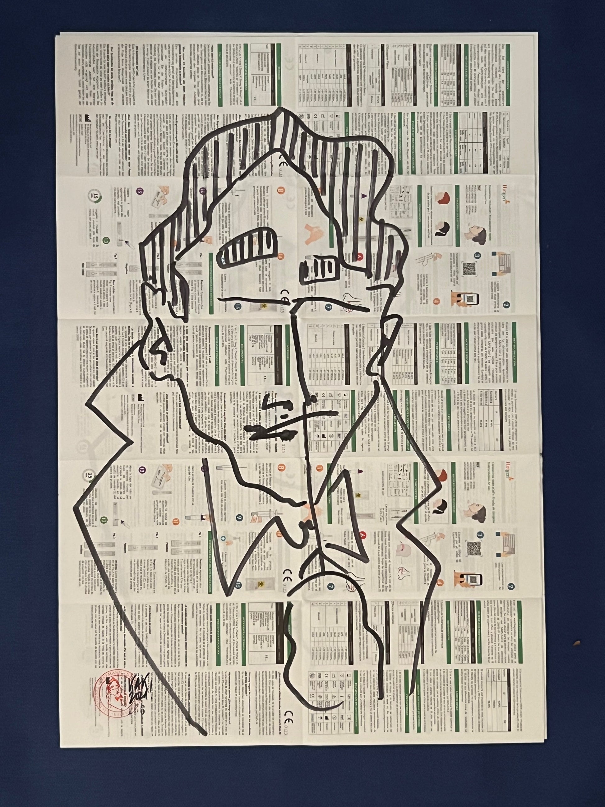 Eine Zeichnung des sich selbst testenden Coronatestmann mit Edding in Schwarz auf dem Beipackzettel eines Corona-Antigentests. Dieses Original ist signiert sowie datiert im September 2020 und trägt die fortlaufende Nummer 166.