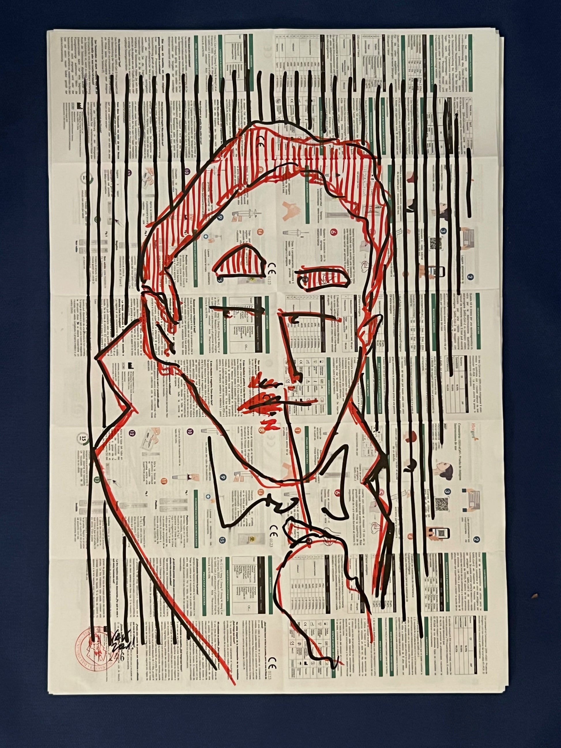 Eine Zeichnung des sich selbst testenden Coronatestmann mit Edding in Rot und Schwarz auf dem Beipackzettel eines Corona-Antigentests. Dieses Original ist signiert sowie datiert im September 2020 und trägt die fortlaufende Nummer 146.
