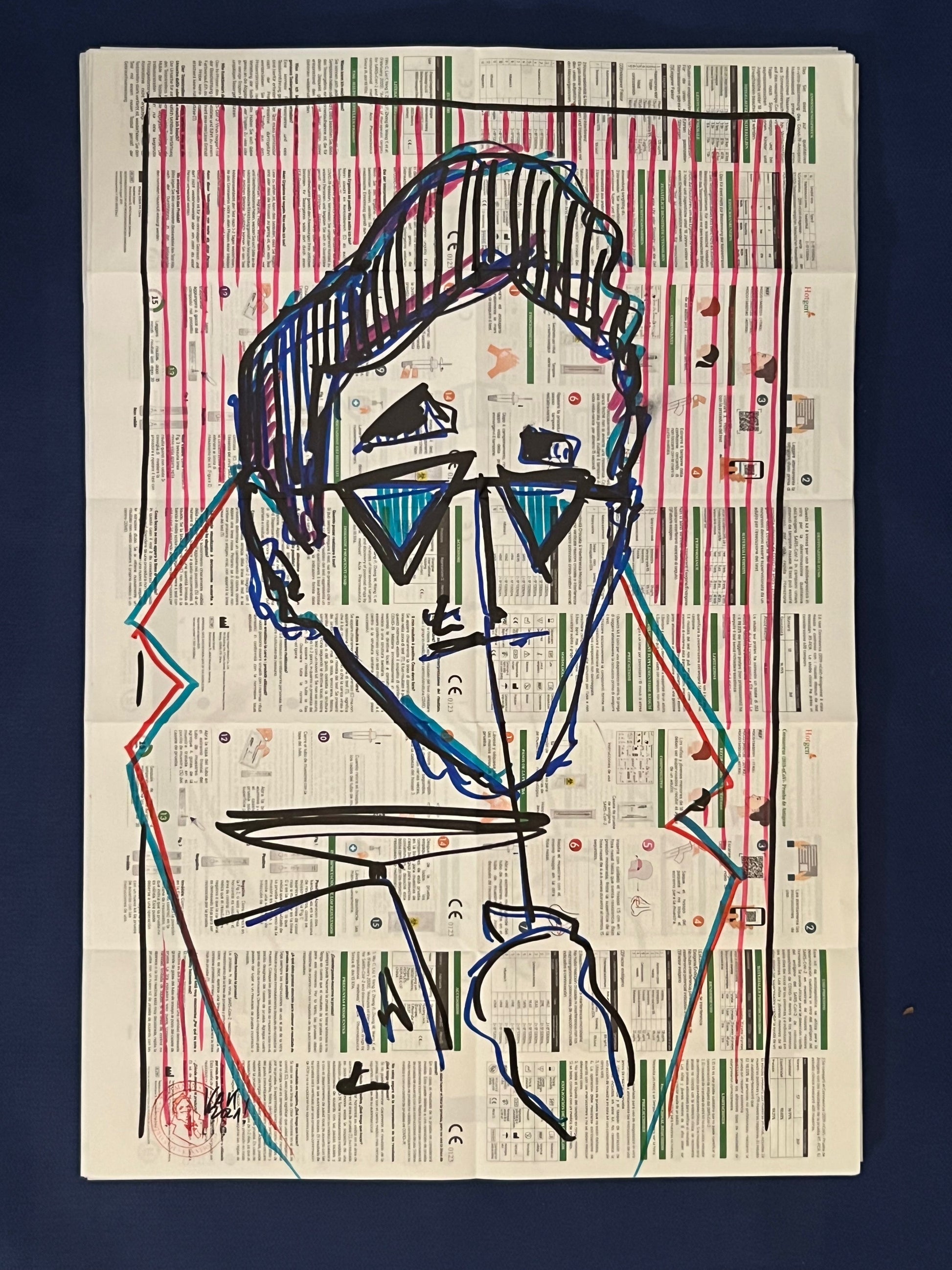 Eine Zeichnung des sich selbst testenden Coronatestmann mit Edding in Pink, Rot, Hellblau, Dunkelblau und Schwarz auf dem Beipackzettel eines Corona-Antigentests. Dieses Original ist signiert sowie datiert im September 2020 und trägt die fortlaufende Nummer 116.