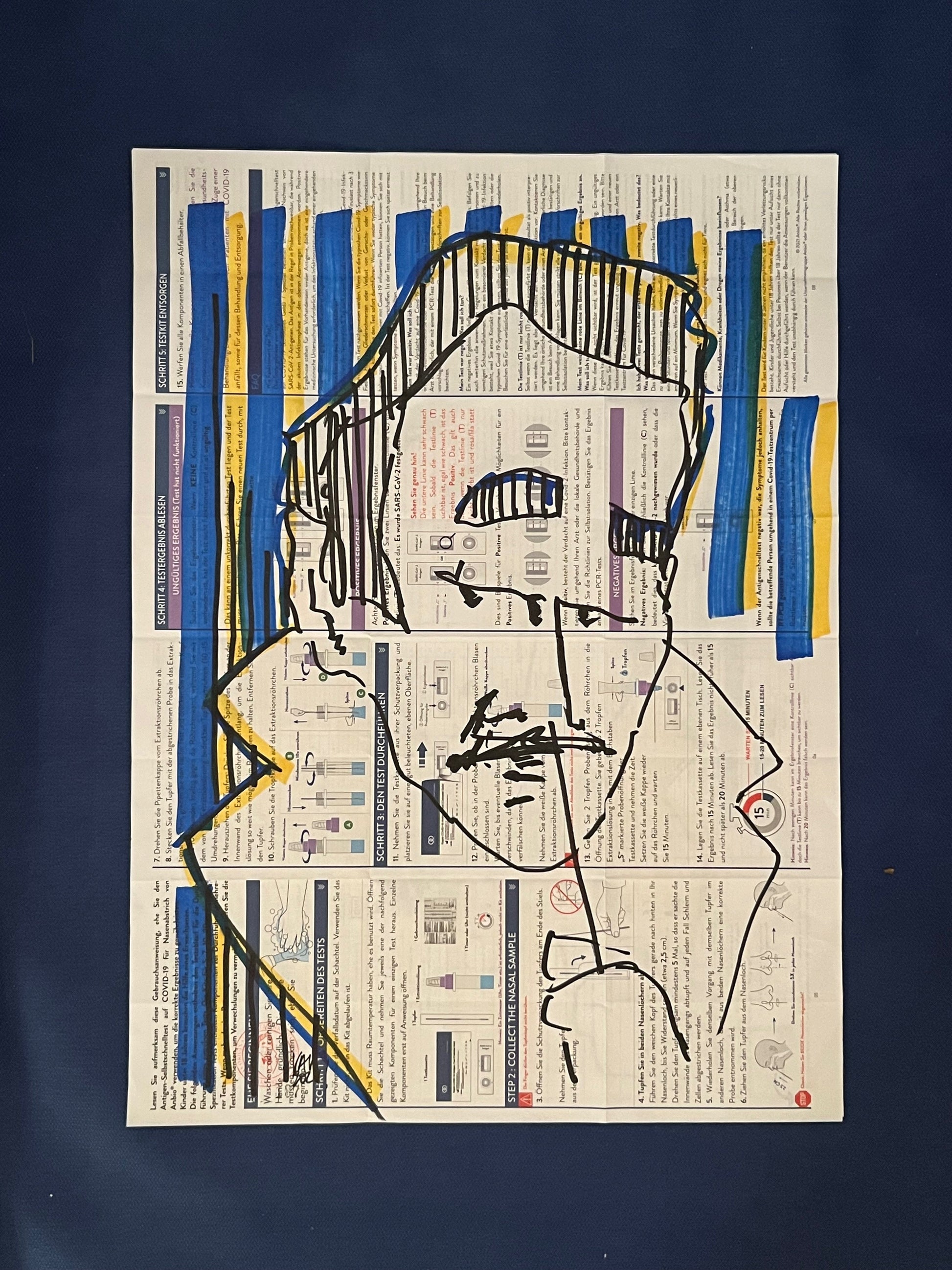 Eine Zeichnung des sich selbst testenden Coronatestmann mit Edding in Gelb, Dunkelblau und Schwarz auf dem Beipackzettel eines Corona-Antigentests. Dieses Original ist signiert sowie datiert im Oktober 2021 und trägt die fortlaufende Nummer 187.
