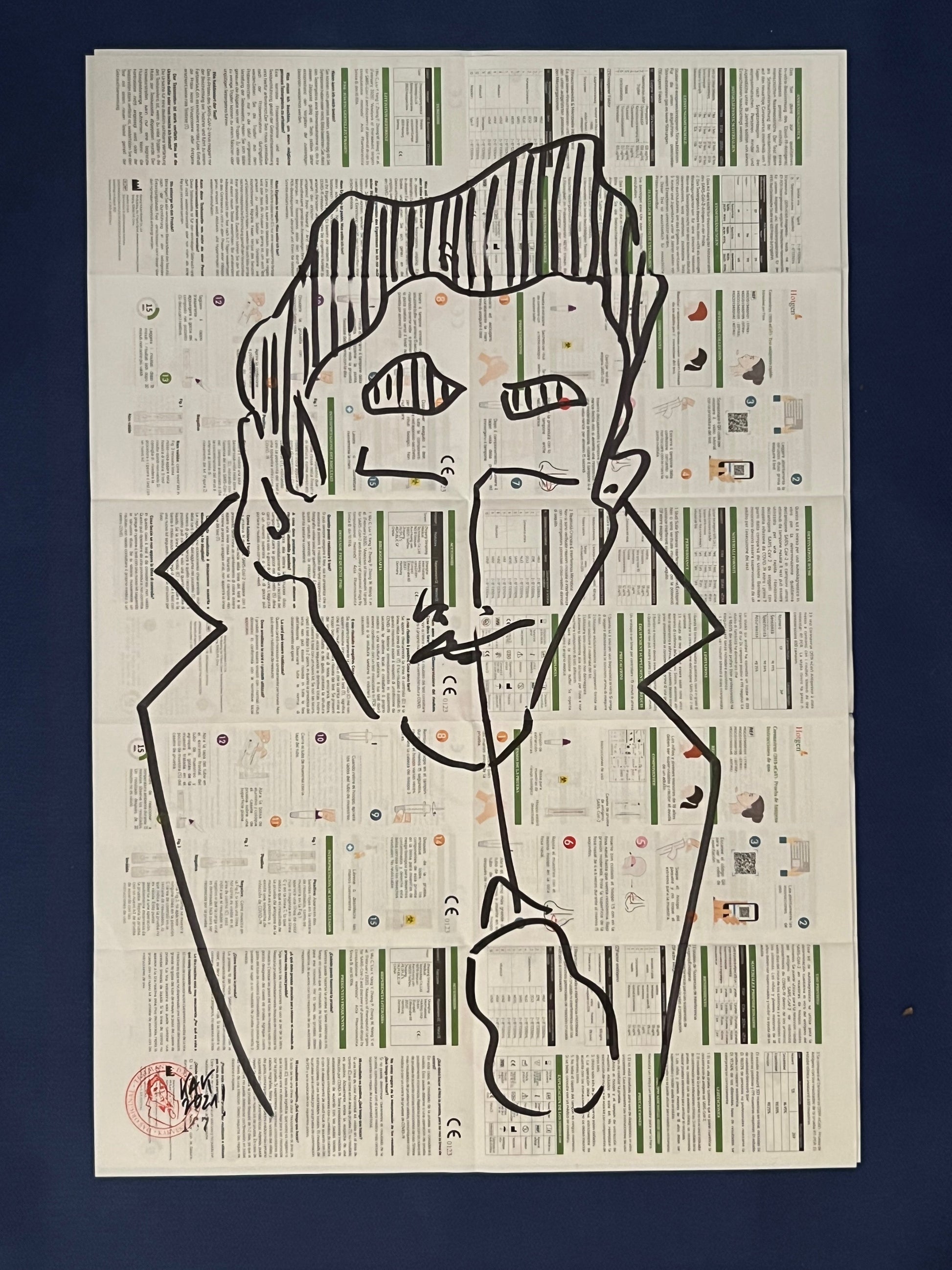 Eine Zeichnung des sich selbst testenden Coronatestmann mit Edding in Schwarz auf dem Beipackzettel eines Corona-Antigentests. Dieses Original ist signiert sowie datiert im September 2020 und trägt die fortlaufende Nummer 167.