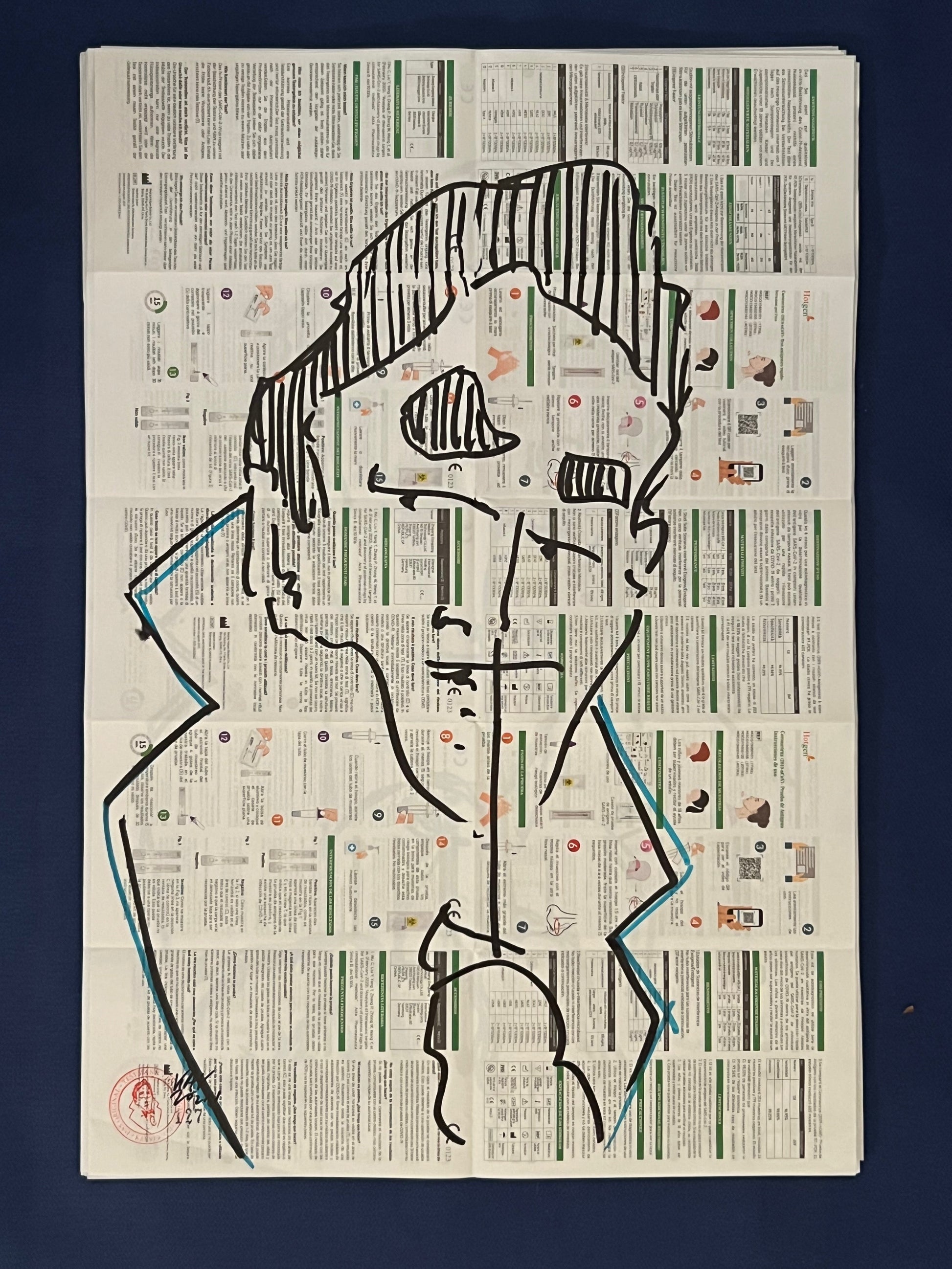 Eine Zeichnung des sich selbst testenden Coronatestmann mit Edding in Schwarz und Hellblau auf dem Beipackzettel eines Corona-Antigentests. Dieses Original ist signiert sowie datiert im September 2020 und trägt die fortlaufende Nummer 127.