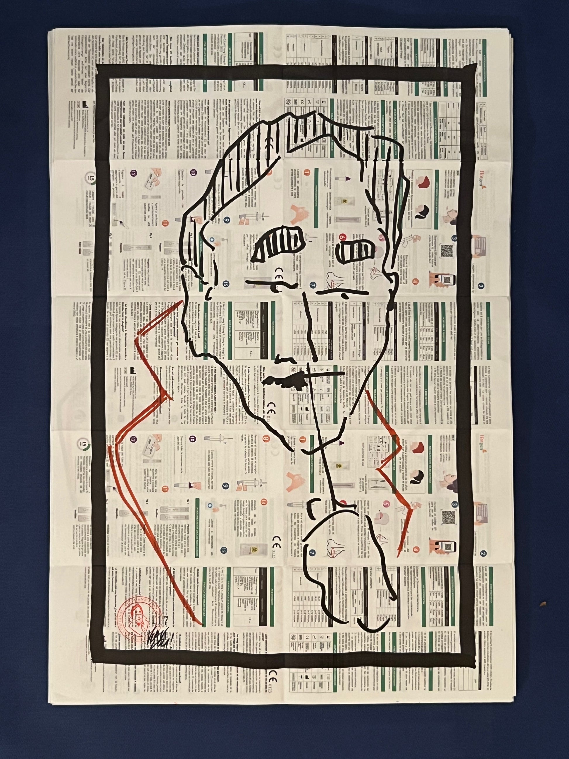 Eine Zeichnung des sich selbst testenden Coronatestmann mit Edding in Braun und Schwarz auf dem Beipackzettel eines Corona-Antigentests. Dieses Original ist signiert sowie datiert im September 2020 und trägt die fortlaufende Nummer 117.