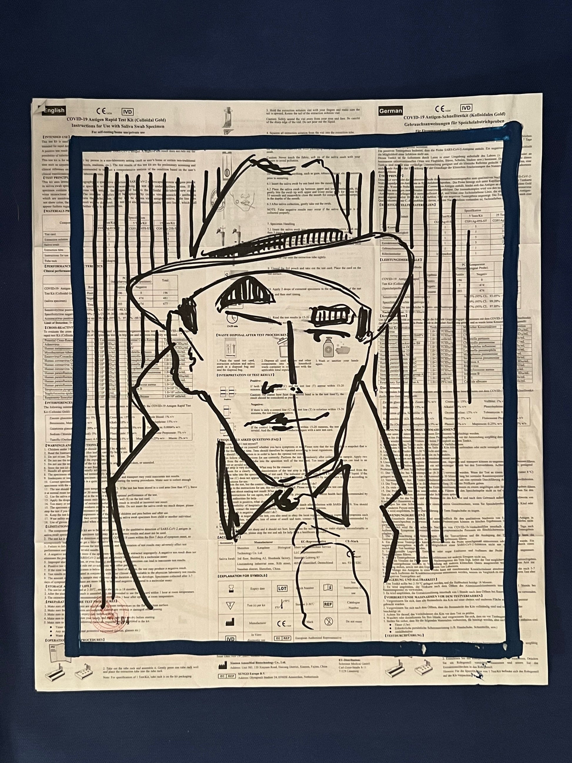 Eine Zeichnung des sich selbst testenden Coronatestmann mit Edding und Lackstift in Dunkelblau und Schwarz auf dem Beipackzettel eines Corona-Antigentests. Dieses Original ist signiert sowie datiert im November 2021 und trägt die fortlaufende Nummer 194.