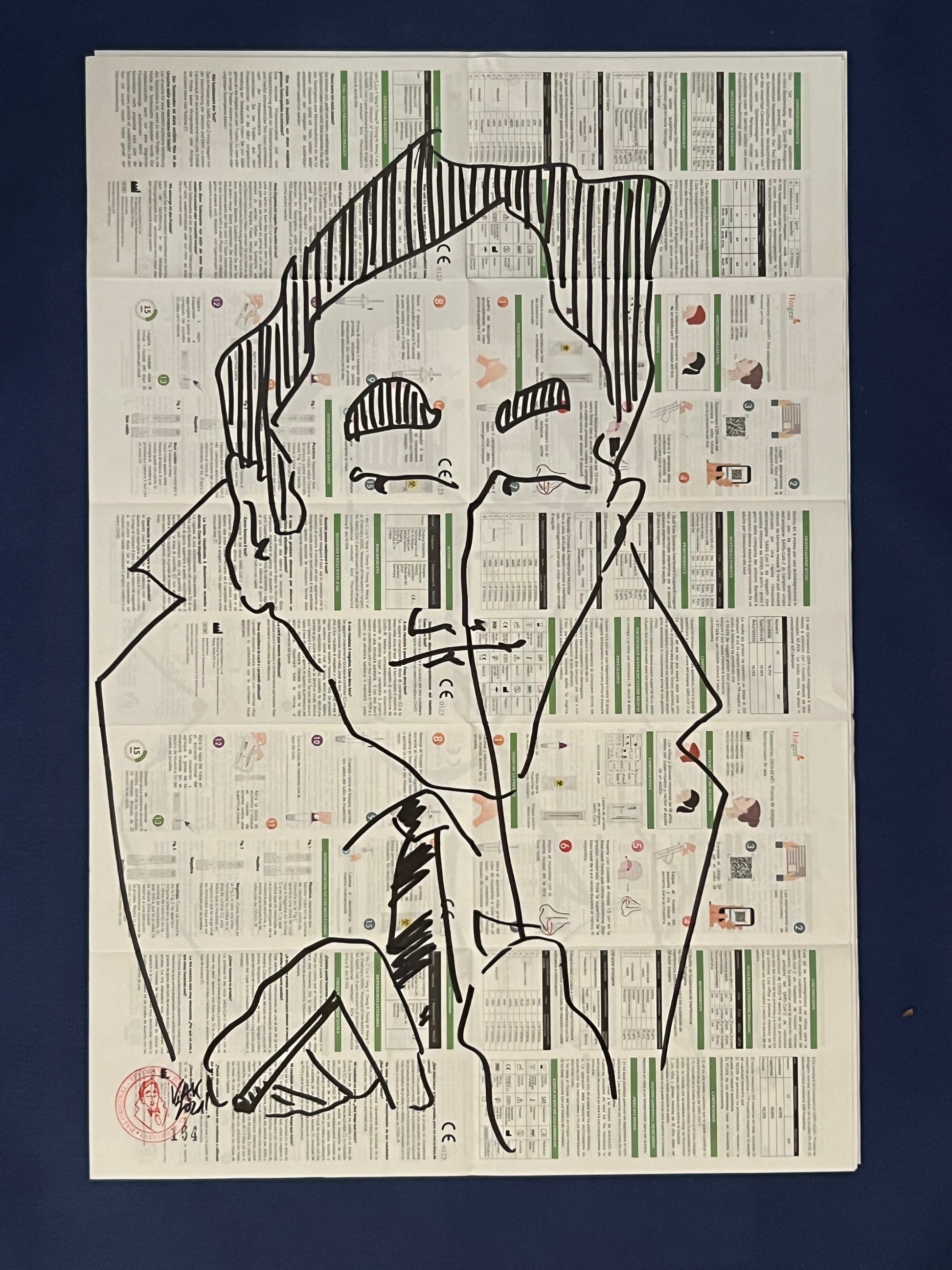Eine Zeichnung des sich selbst testenden Coronatestmann mit Edding in Schwarz auf dem Beipackzettel eines Corona-Antigentests. Dieses Original ist signiert sowie datiert im September 2020 und trägt die fortlaufende Nummer 164.