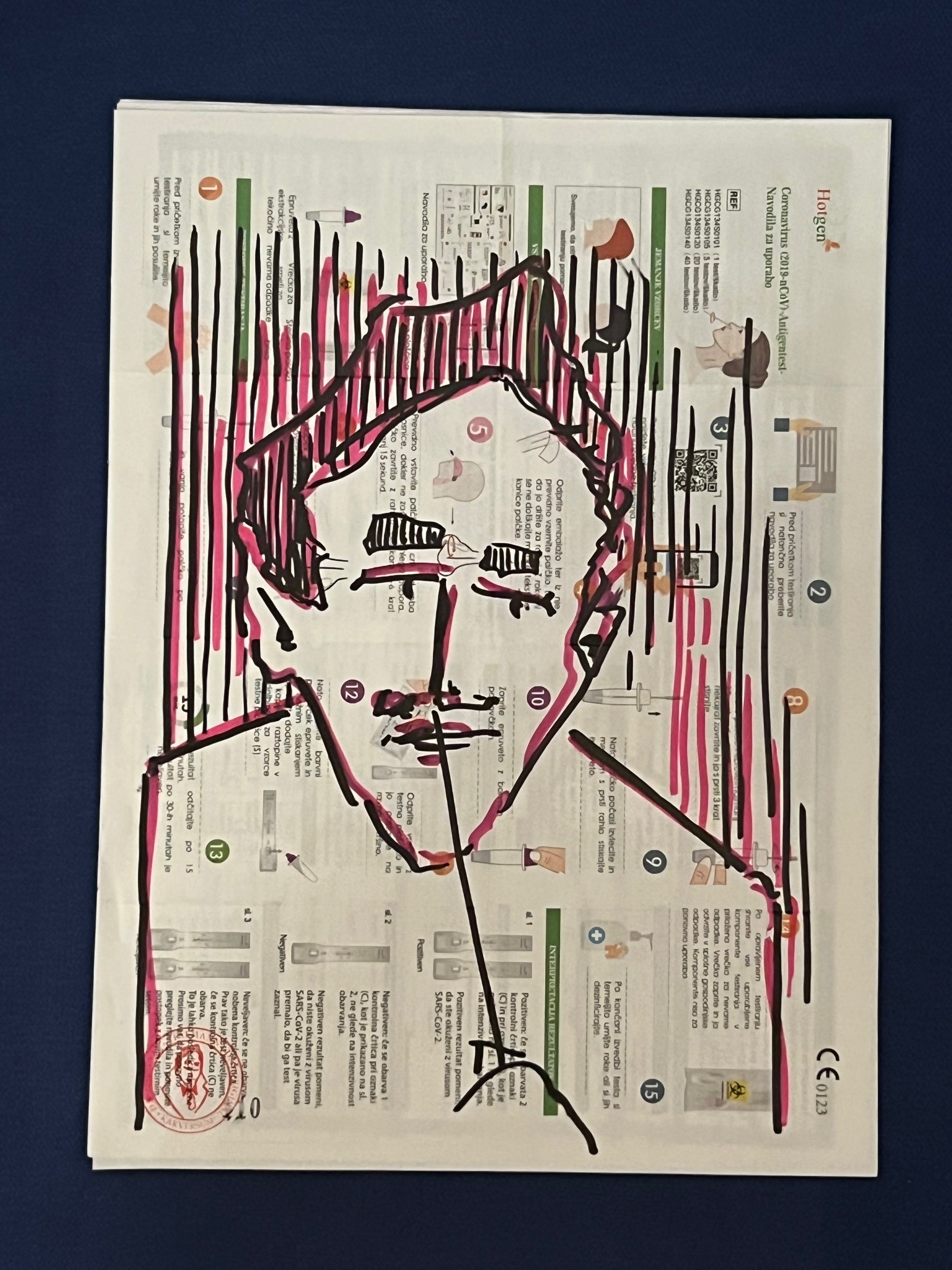 Eine Zeichnung des sich selbst testenden Coronatestmann mit Edding in Pink und Schwarz auf dem Beipackzettel eines Corona-Antigentests. Dieses Original ist signiert sowie datiert im August 2021 und trägt die fortlaufende Nummer 110.