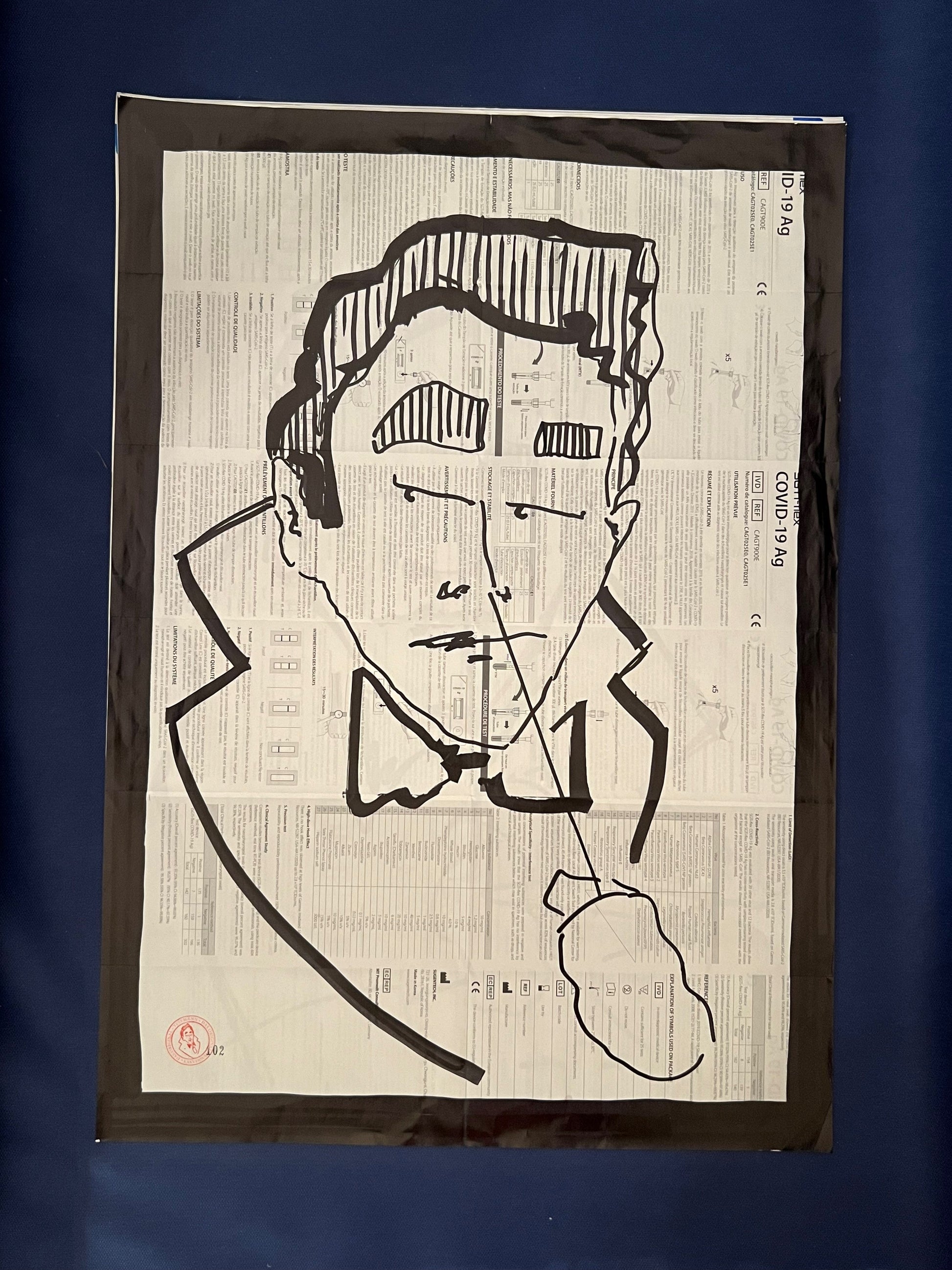 Eine Zeichnung des sich selbst testenden Coronatestmann mit Edding in Schwarz auf dem Beipackzettel eines Corona-Antigentests. Dieses Original ist signiert sowie datiert im August 2021 und trägt die fortlaufende Nummer 102.