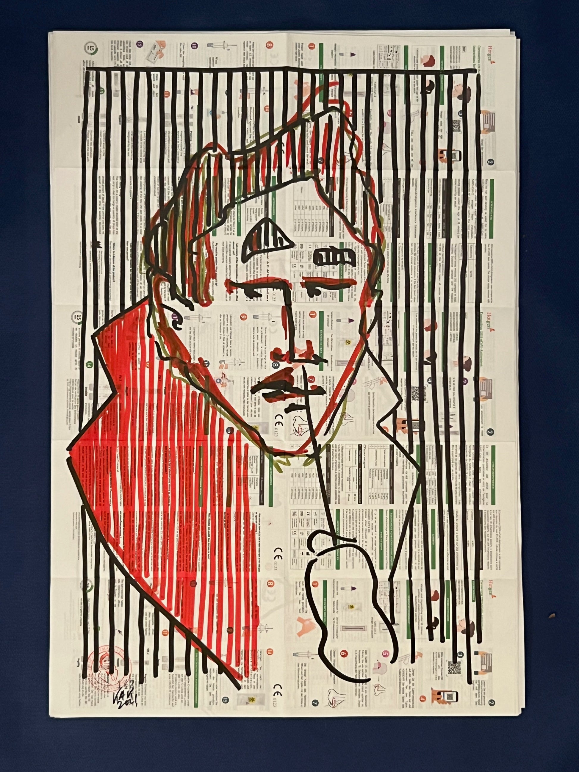 Eine Zeichnung des sich selbst testenden Coronatestmann mit Edding in Rot, Olivgrün und Schwarz auf dem Beipackzettel eines Corona-Antigentests. Dieses Original ist signiert sowie datiert im September 2020 und trägt die fortlaufende Nummer 142.