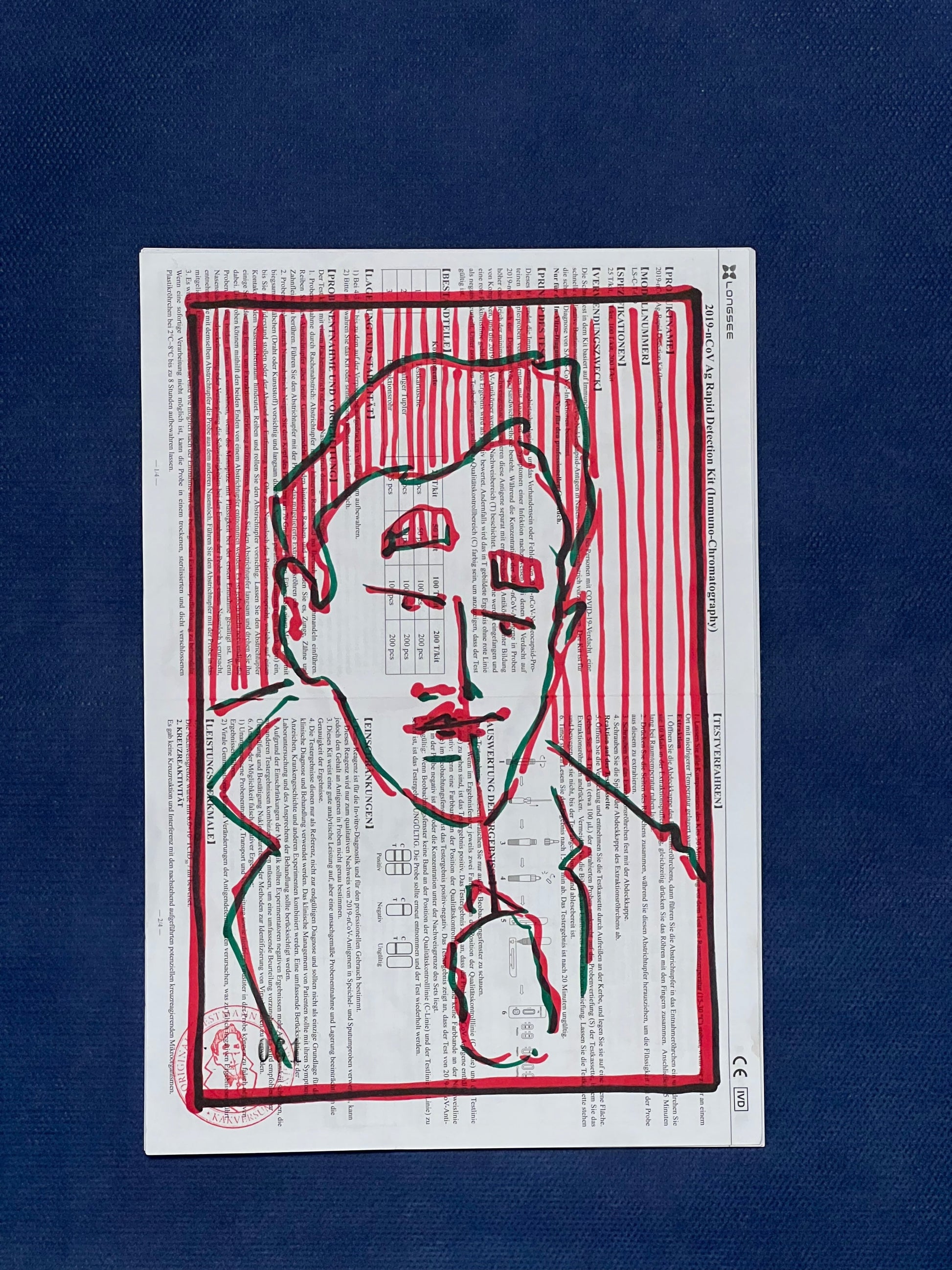 Eine Zeichnung des sich selbst testenden Coronatestmann mit Edding in Rot, Dunkelgrün und Schwarz auf dem Beipackzettel eines Corona-Antigentests. Dieses Original ist signiert sowie datiert im April 2021 und trägt die fortlaufende Nummer 061.