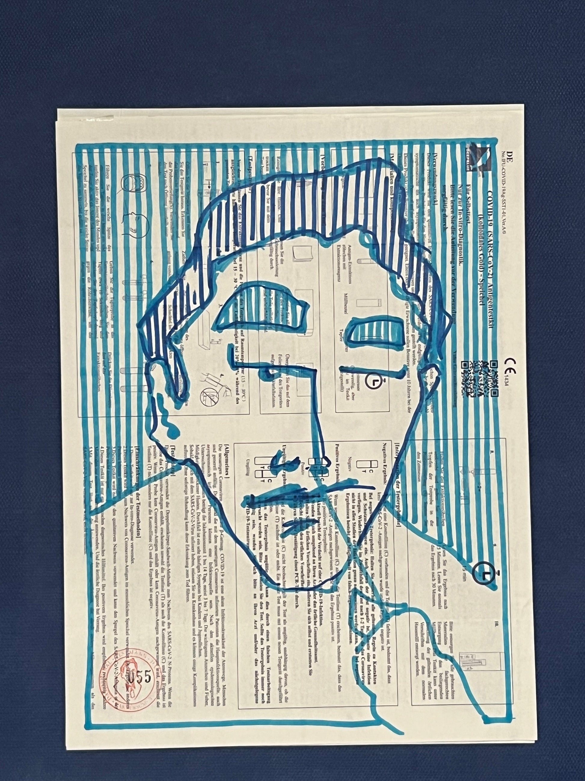 Eine Zeichnung des sich selbst testenden Coronatestmann mit Edding in Hellblau und Dunkelblau auf dem Beipackzettel eines Corona-Antigentests. Dieses Original ist signiert sowie datiert im April 2021 und trägt die fortlaufende Nummer 055.