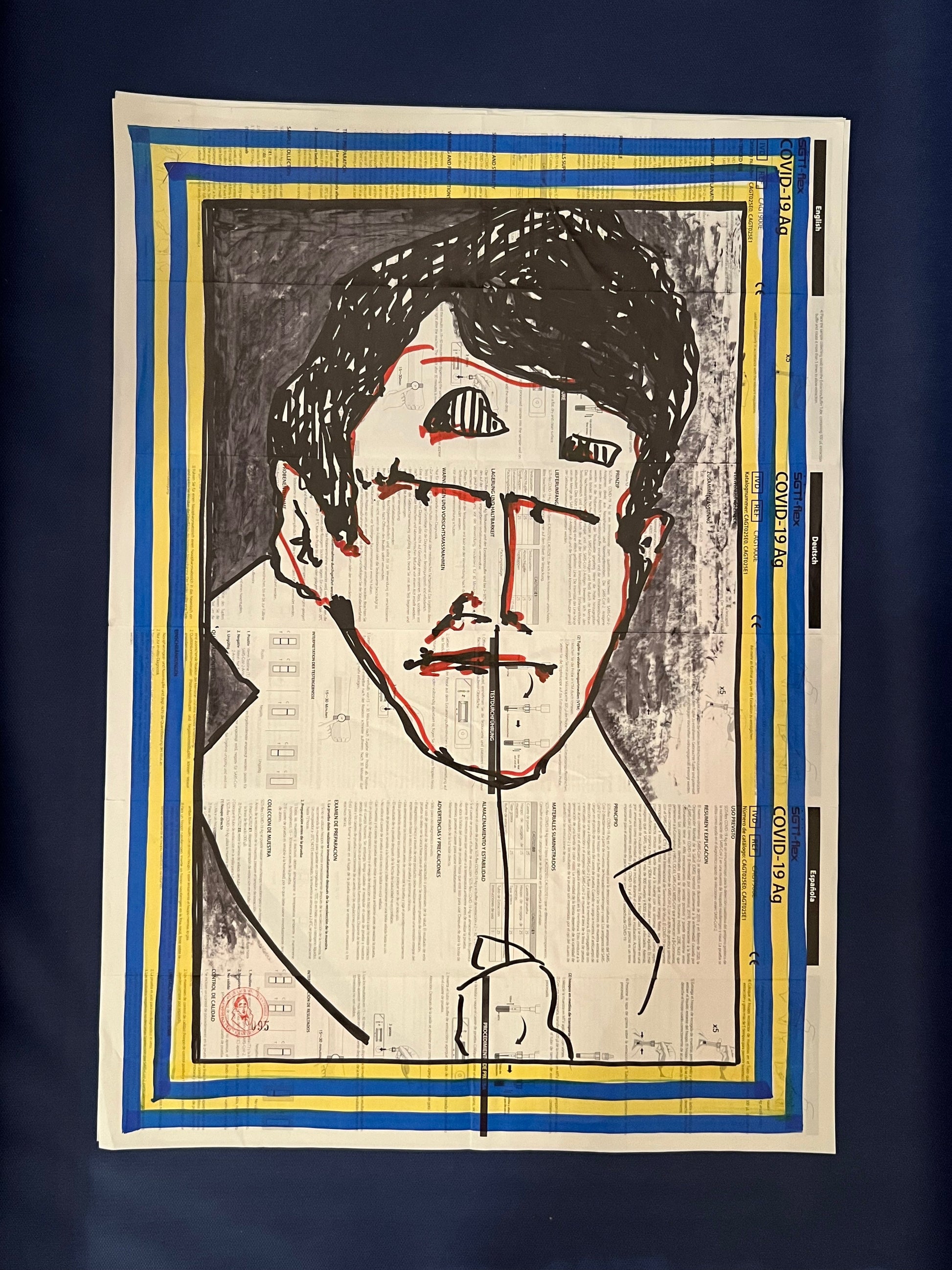 Eine Zeichnung des sich selbst testenden Coronatestmann mit Edding in Rot, Gelb, Dunkelblau und Schwarz auf dem Beipackzettel eines Corona-Antigentests. Dieses Original ist signiert sowie datiert im August 2021 und trägt die fortlaufende Nummer 095.