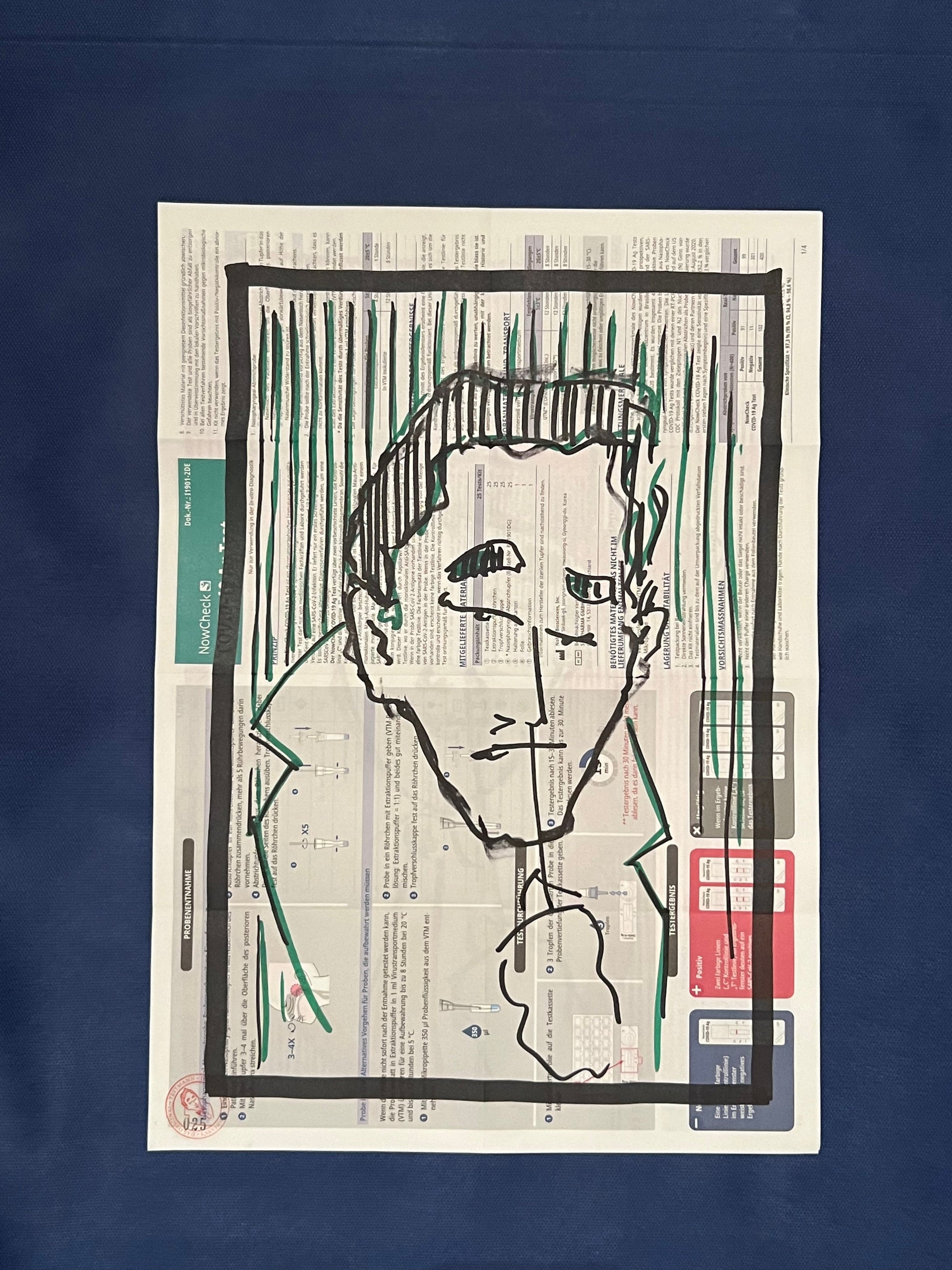 Eine Zeichnung des sich selbst testenden Coronatestmann mit Edding in Dunkelgrün und Schwarz auf dem Beipackzettel eines Corona-Antigentests. Dieses Original ist signiert sowie datiert im November 2020 und trägt die fortlaufende Nummer 025.