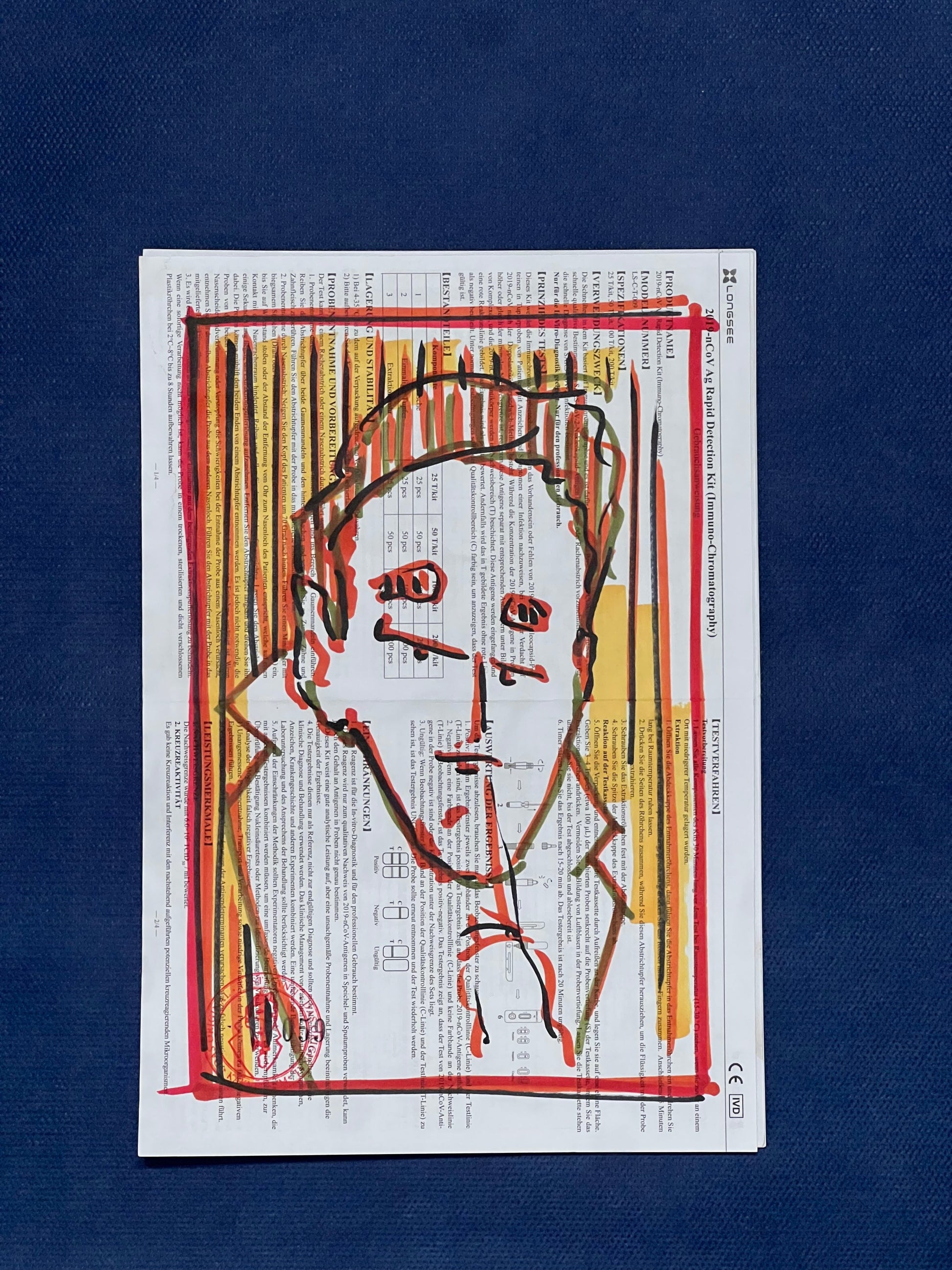 Eine Zeichnung des sich selbst testenden Coronatestmann mit Edding in Olivgrün, Gelb, Rot, Orange und Schwarz auf dem Beipackzettel eines Corona-Antigentests. Dieses Original ist signiert sowie datiert im April 2021 und trägt die fortlaufende Nummer 059.