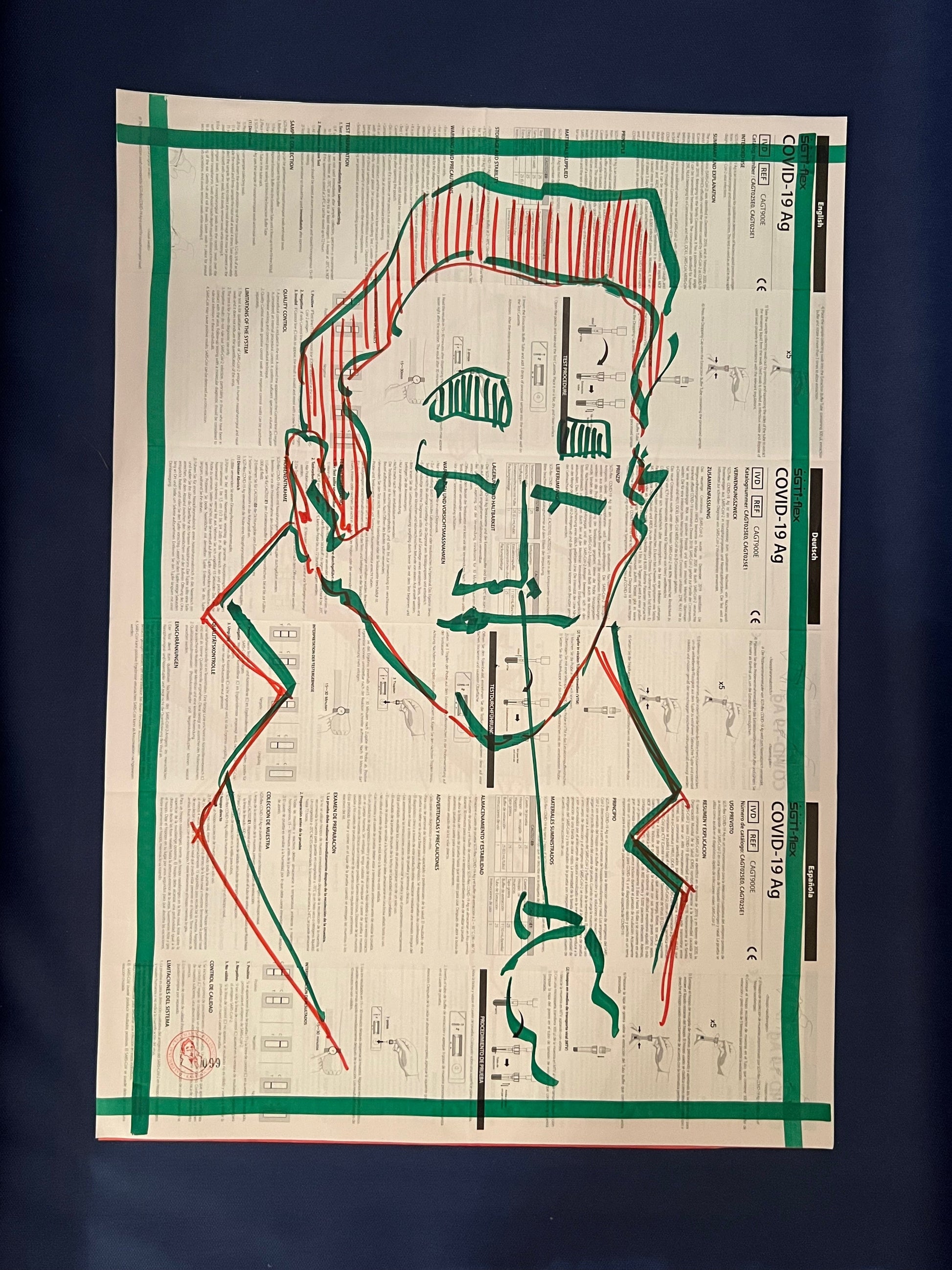 Eine Zeichnung des sich selbst testenden Coronatestmann mit Edding in Dunkelgrün und Rot auf dem Beipackzettel eines Corona-Antigentests. Dieses Original ist signiert sowie datiert im August 2021 und trägt die fortlaufende Nummer 099.