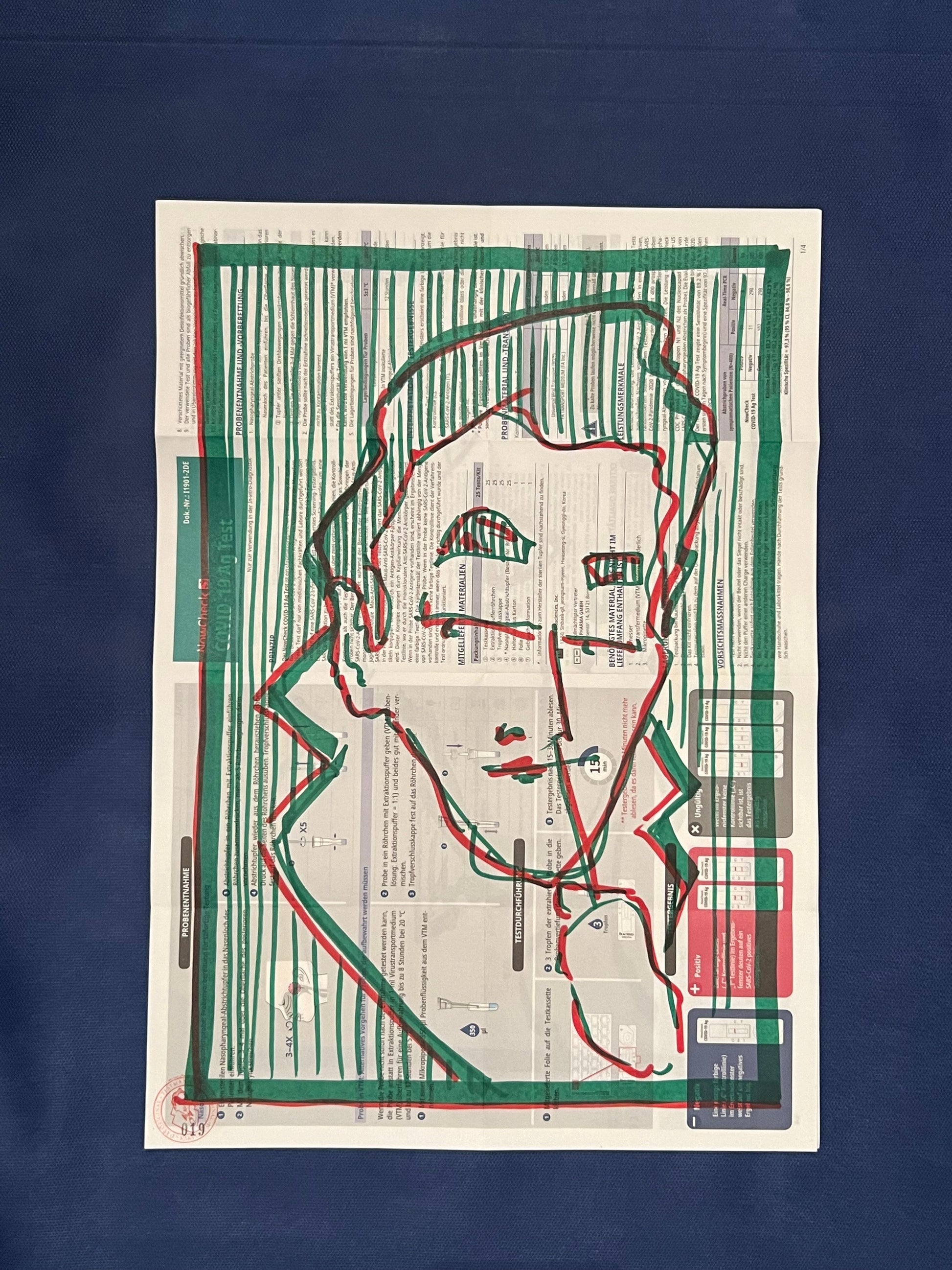 Eine Zeichnung des sich selbst testenden Coronatestmann mit Edding in Rot und Grün auf dem Beipackzettel eines Corona-Antigentests. Dieses Original ist signiert sowie datiert im November 2020 und trägt die fortlaufende Nummer 019.