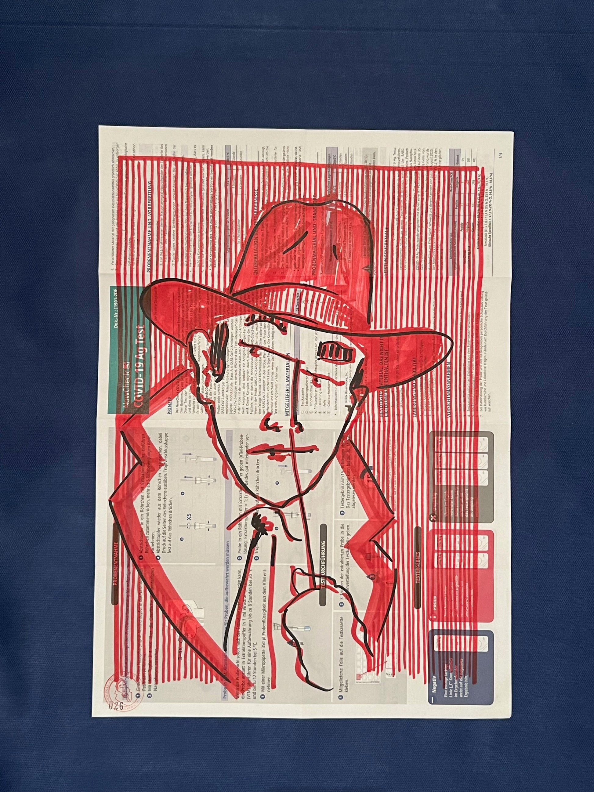 Eine Zeichnung des sich selbst testenden Coronatestmann mit Edding in Rot und Schwarz auf dem Beipackzettel eines Corona-Antigentests. Dieses Original ist signiert sowie datiert im November 2020 und trägt die fortlaufende Nummer 026.